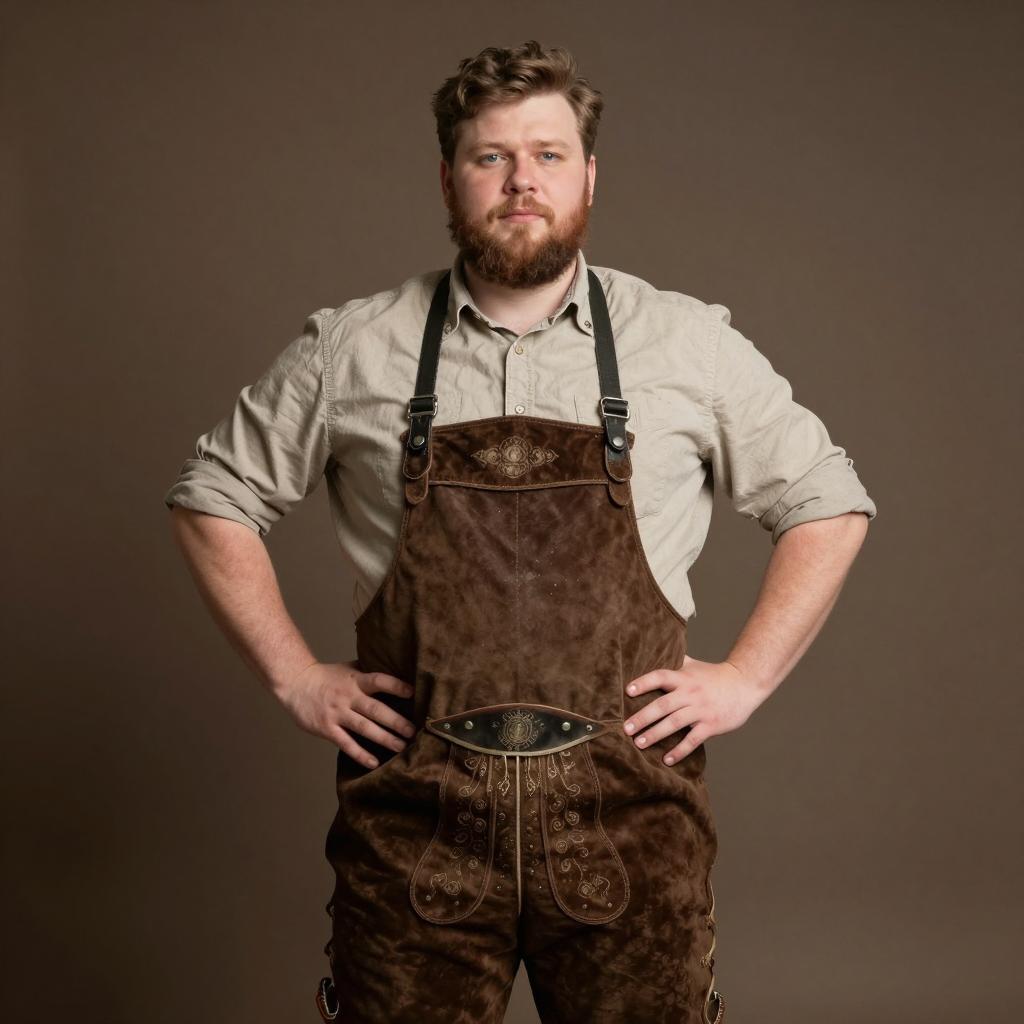 Full body portrait of a white bearded man with brown hair wearing a beige shirt with rolled-up sleeves and brown traditional Lederhosen with black straps. The man stands with hands on hips against a brown background with warm, studio lighting, showing a slight vintage color tone.