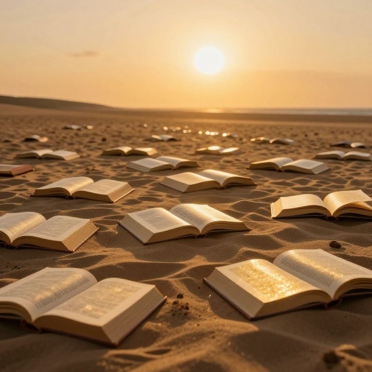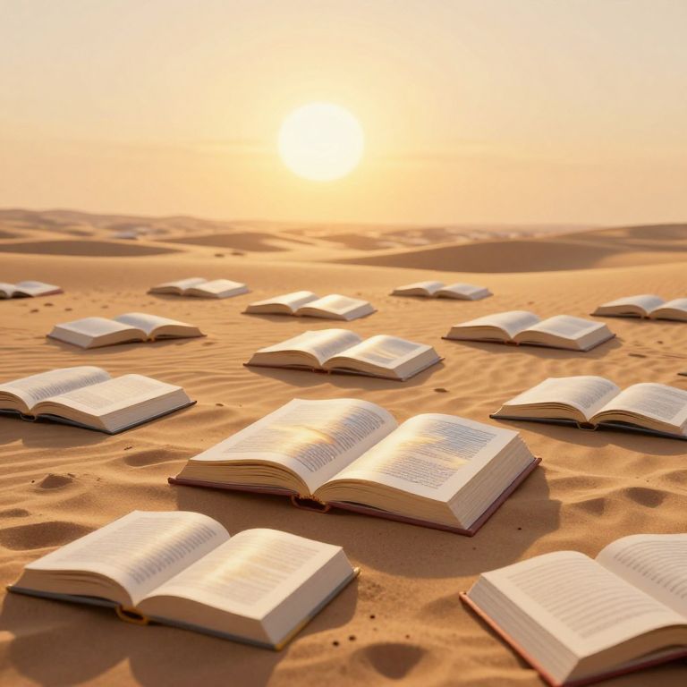 Photograph of several open books of varying sizes and orientations floating in the clear blue sky above a vast, sandy desert with rippled sand dunes in the background. The books are positioned at different heights and angles, casting subtle shadows on the sand below. The sunlight enhances the warm, golden tones of the desert, contrasting with the bright, crisp white pages of the books. The scene conveys a sense of floating knowledge or an ethereal, dreamlike quality.