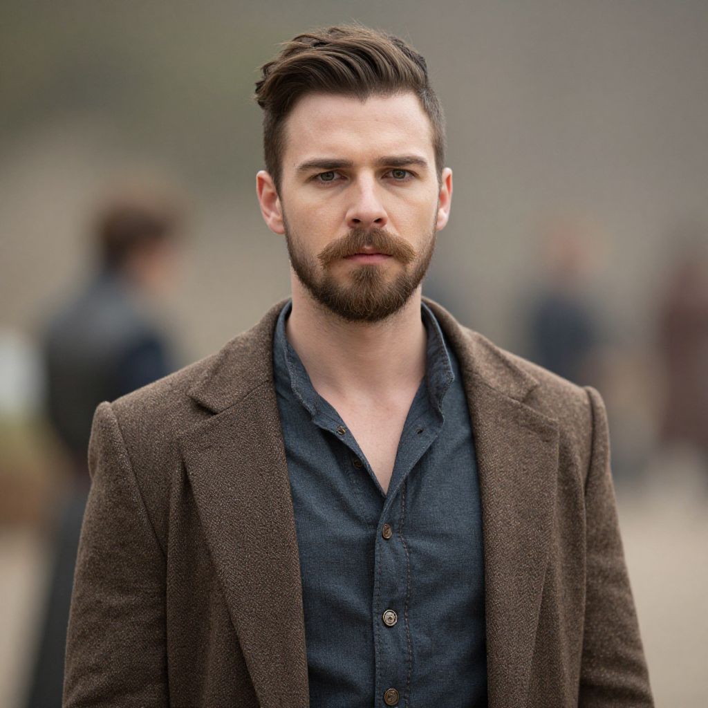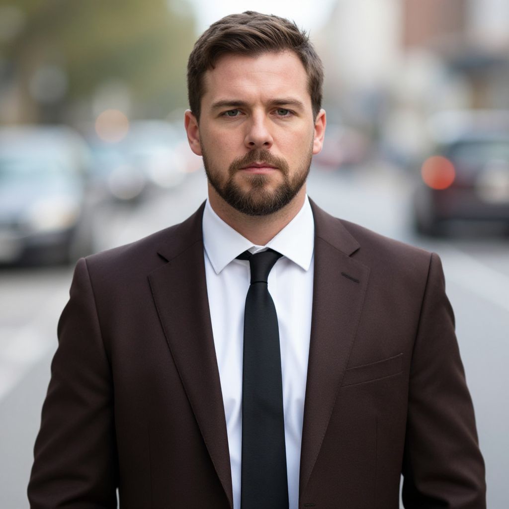 Mike lindell costume, 1boy, male focus, necktie, solo, shirt, blurry background, jacket, looking at viewer, collared shirt, white shirt, outdoors, brown jacket, black necktie, blurry, brown hair, suit, day, closed mouth, straight-on, realistic, upper body, street, formal, road, facial hair, short hair