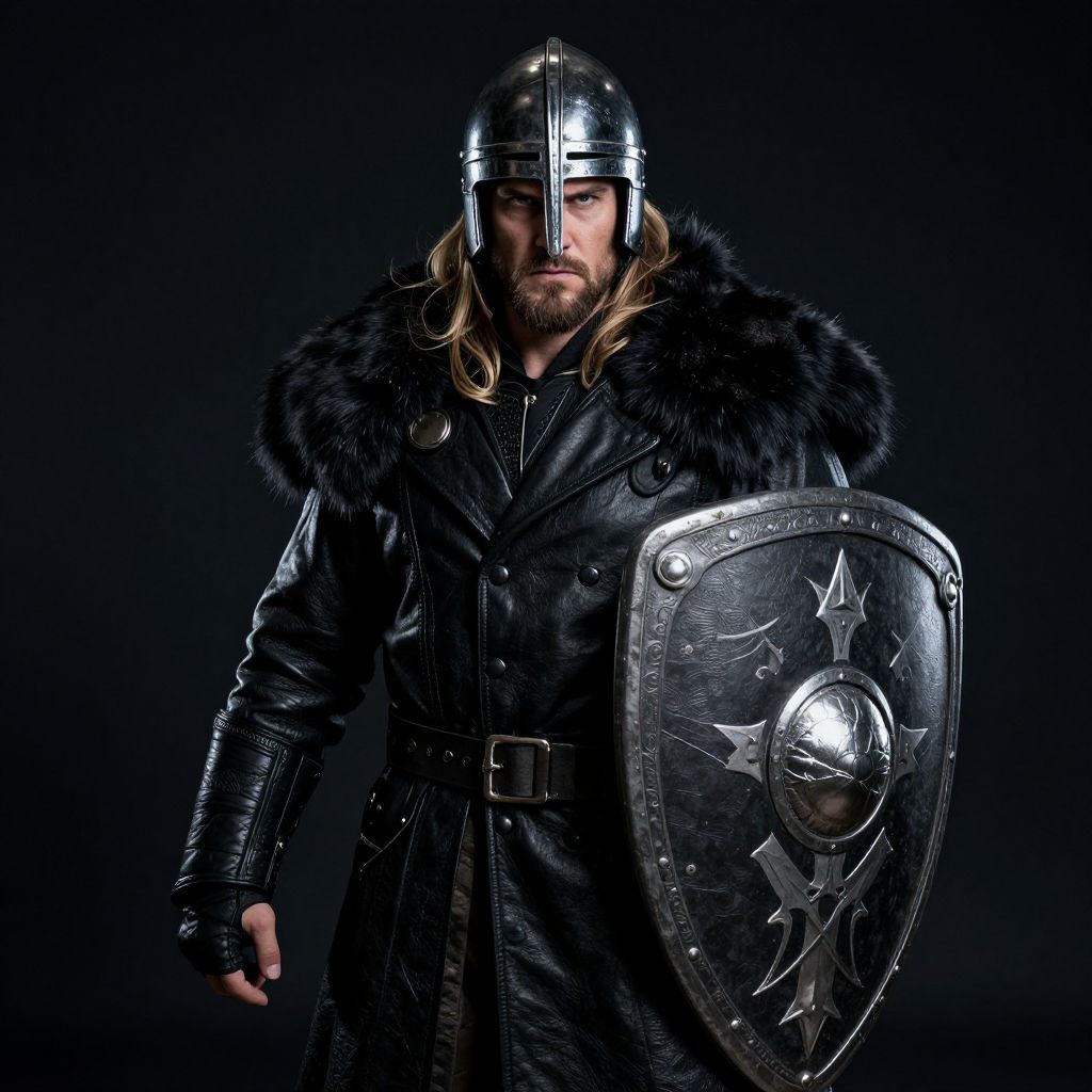 A man with long blonde hair and a beard wearing a black leather coat with a fur collar and a silver helmet. He is holding a large shield with a black and silver design on it, and the background is dark. The man has a strong, rugged appearance, with a commanding presence. His features are defined, with a fierce expression that conveys strength and authority. The overall atmosphere is dark and mysterious, enhancing the dramatic and heroic imagery of the scene.