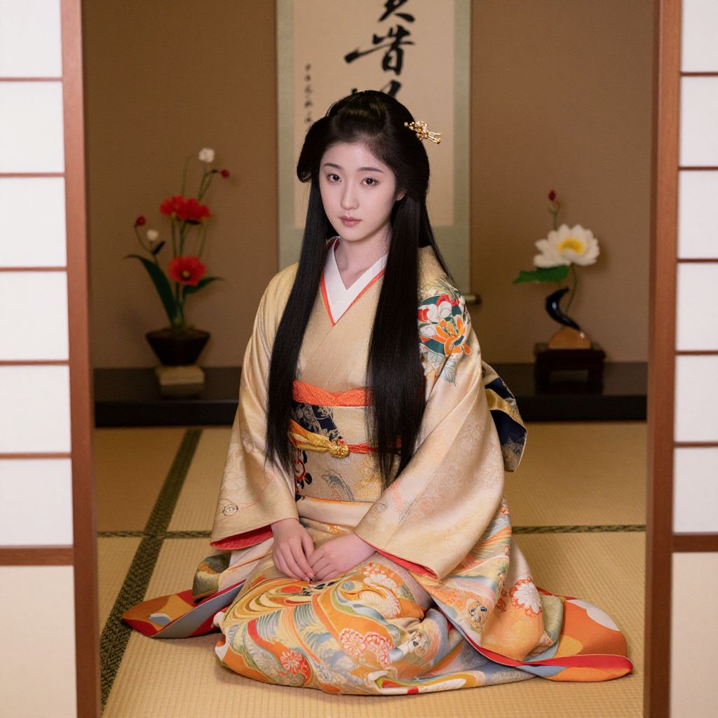 Heian period beauty depicted in a serene indoor setting with tatami mats and sliding shoji doors, traditionally styled robes with elegant hues and intricate patterns, long straight hair with delicate hairpins, subtle radiant makeup, surrounded by calligraphy scrolls and ikebana flower arrangements