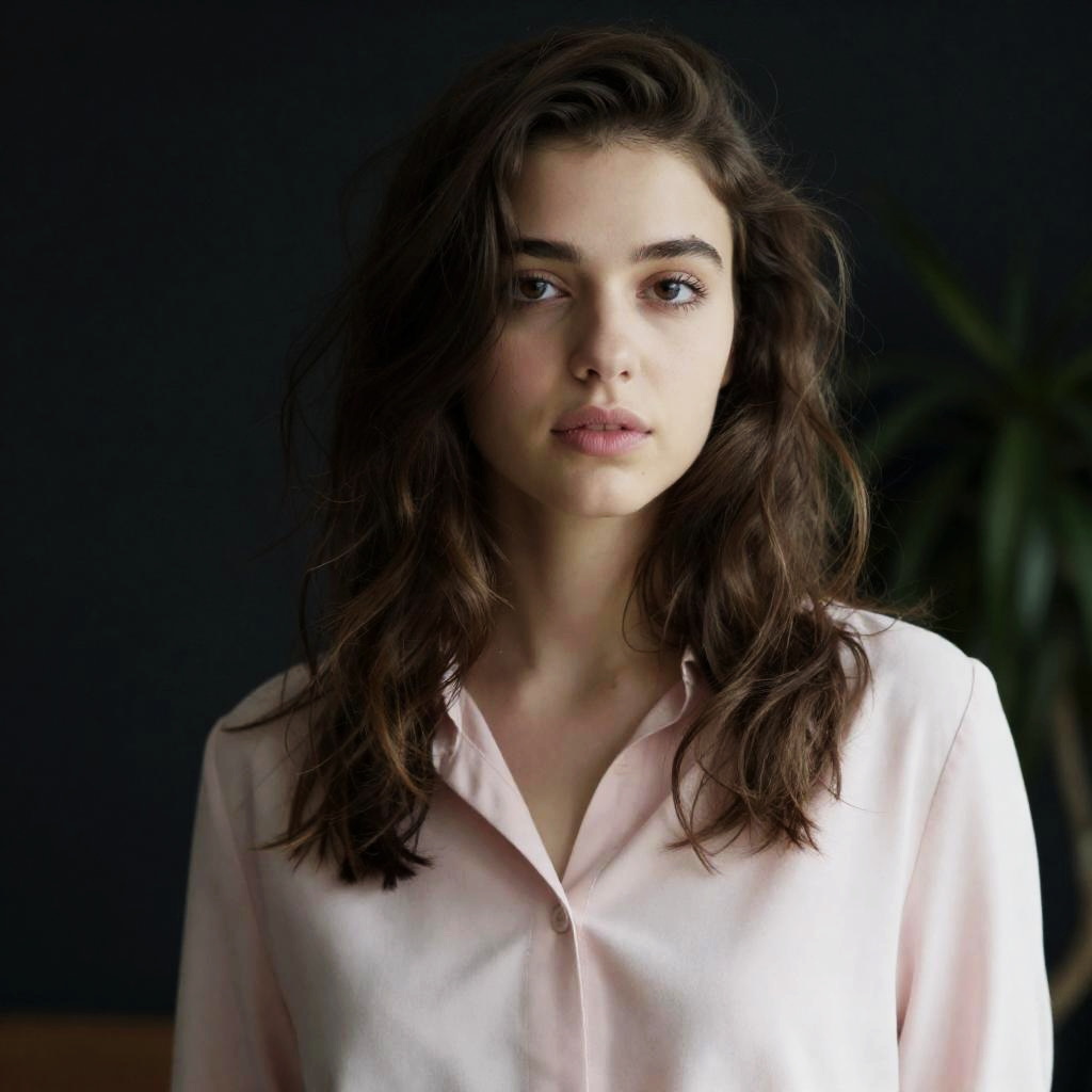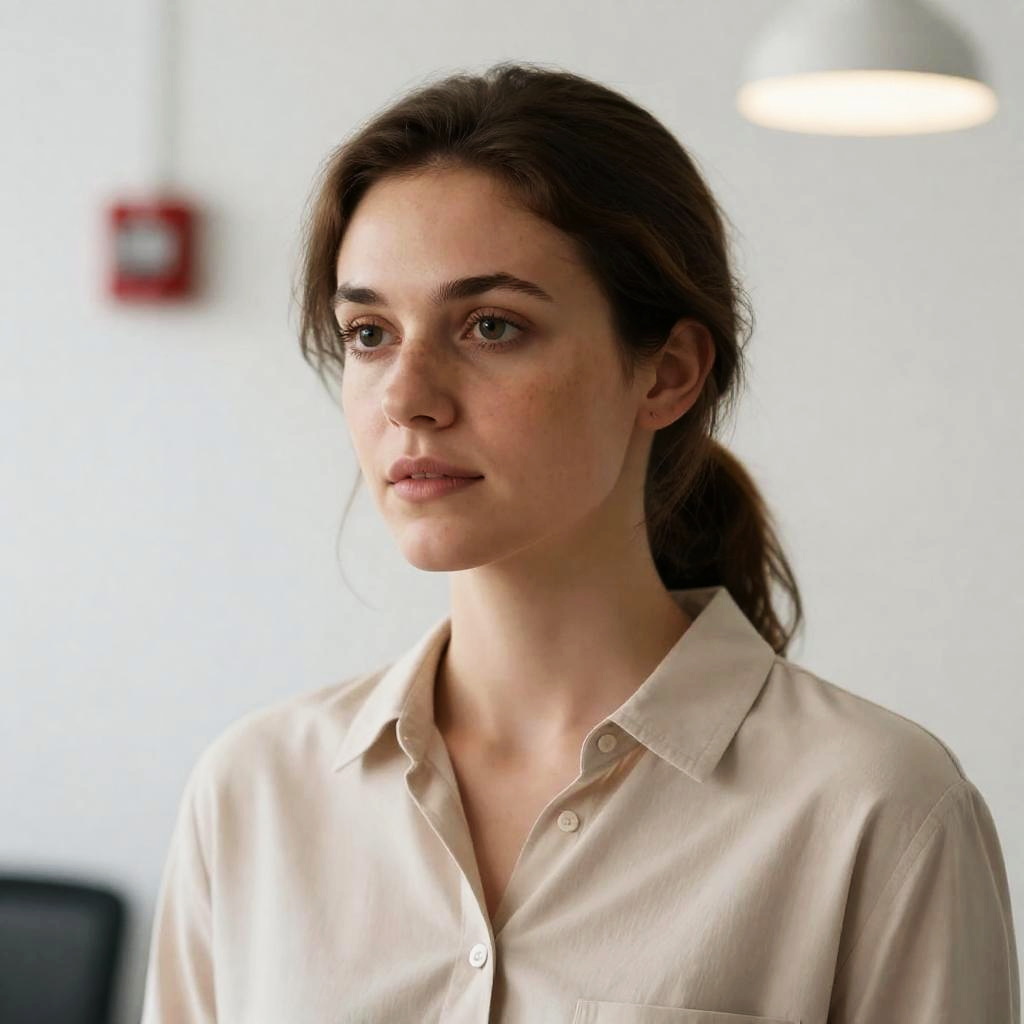Young woman with fair skin and light brown hair in a side profile, wearing a blue striped turtleneck and black jacket, necklace with a cross pendant. Background: old, weathered building with faded windows. Hair blown to the side.