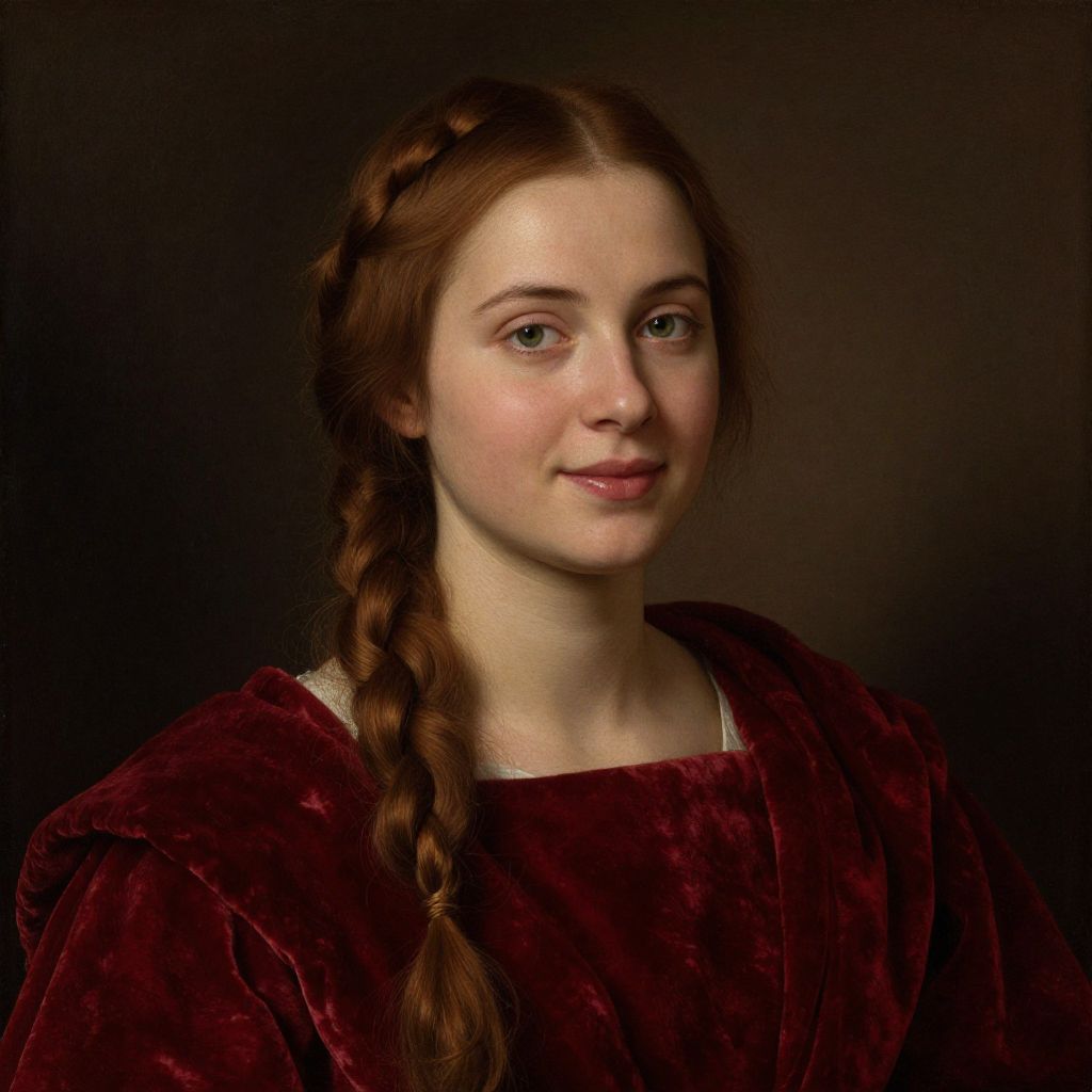 Photograph of a young woman with fair skin and light freckles, featuring auburn hair styled in a single braid over her right shoulder. She has light blue eyes and a subtle smile. She wears a rich, dark red velvet dress with a square neckline. The background is solid black, highlighting her face and attire. The lighting is soft, creating gentle shadows that add depth to her features. The overall style is reminiscent of classical portraiture.