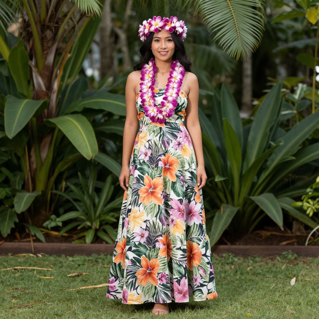 Modern Hawaiian Outfit Female Costume, a woman in a floral dress standing in a garden