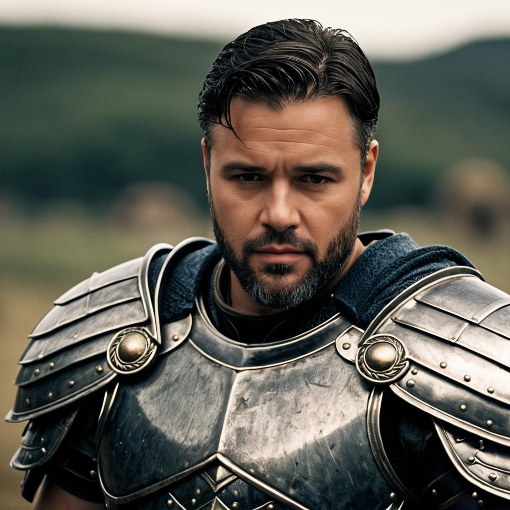 Portrait of a serious man with short black hair and facial hair wearing detailed metal medieval armor including pauldrons and breastplate. He has a focused expression with a subtle frown and a scar on his face, set against a blurred outdoor background.