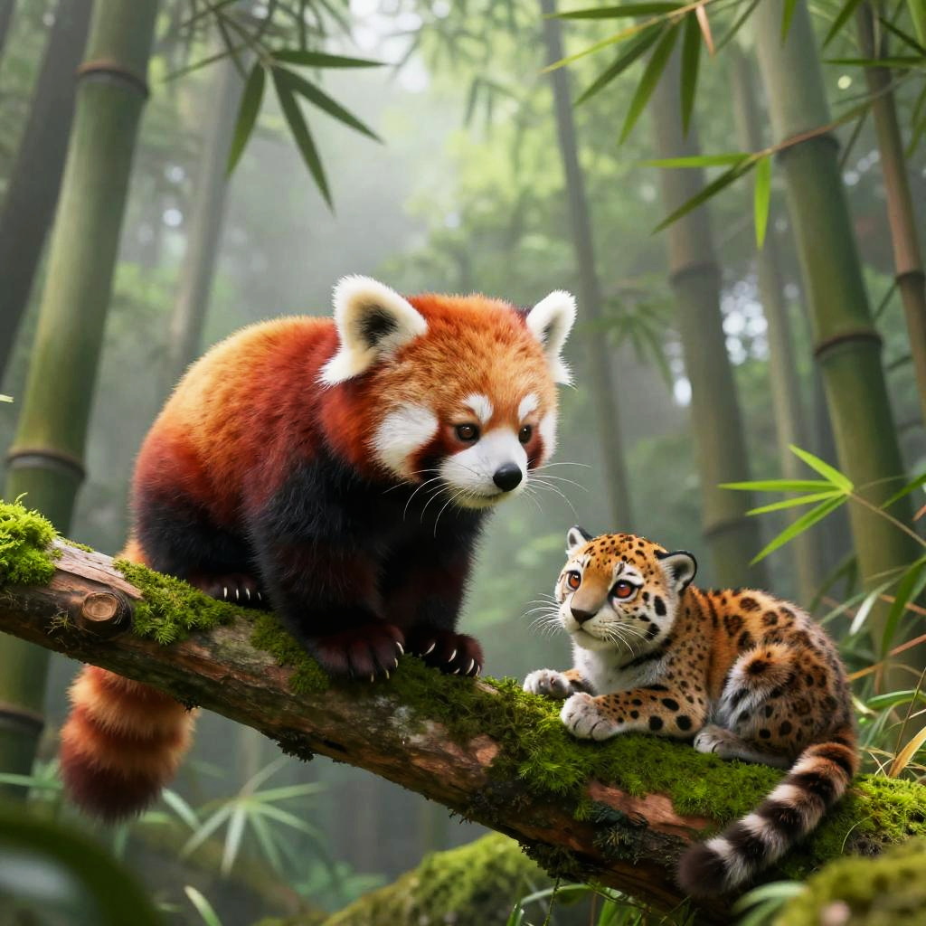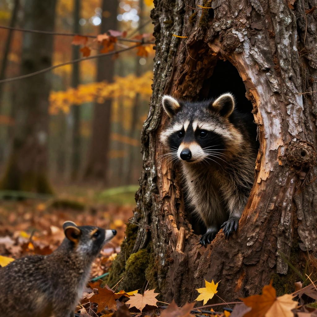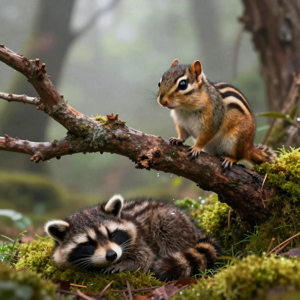 3D Animation of a striped chipmunk perched on a twisted oak branch, peering down at a softly sleeping raccoon reclining on emerald moss, immersed in a dewy misty woodland with soft focus on the striped chipmunk.