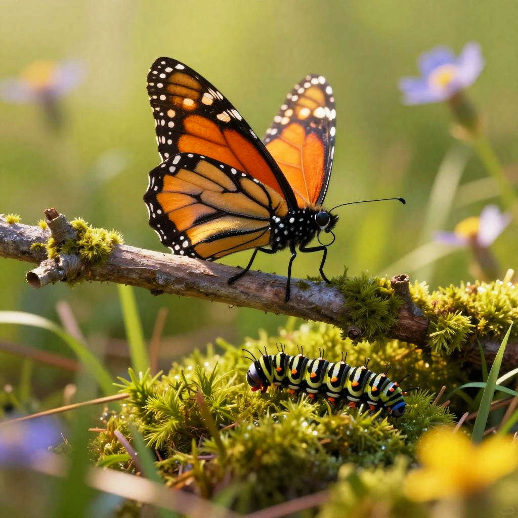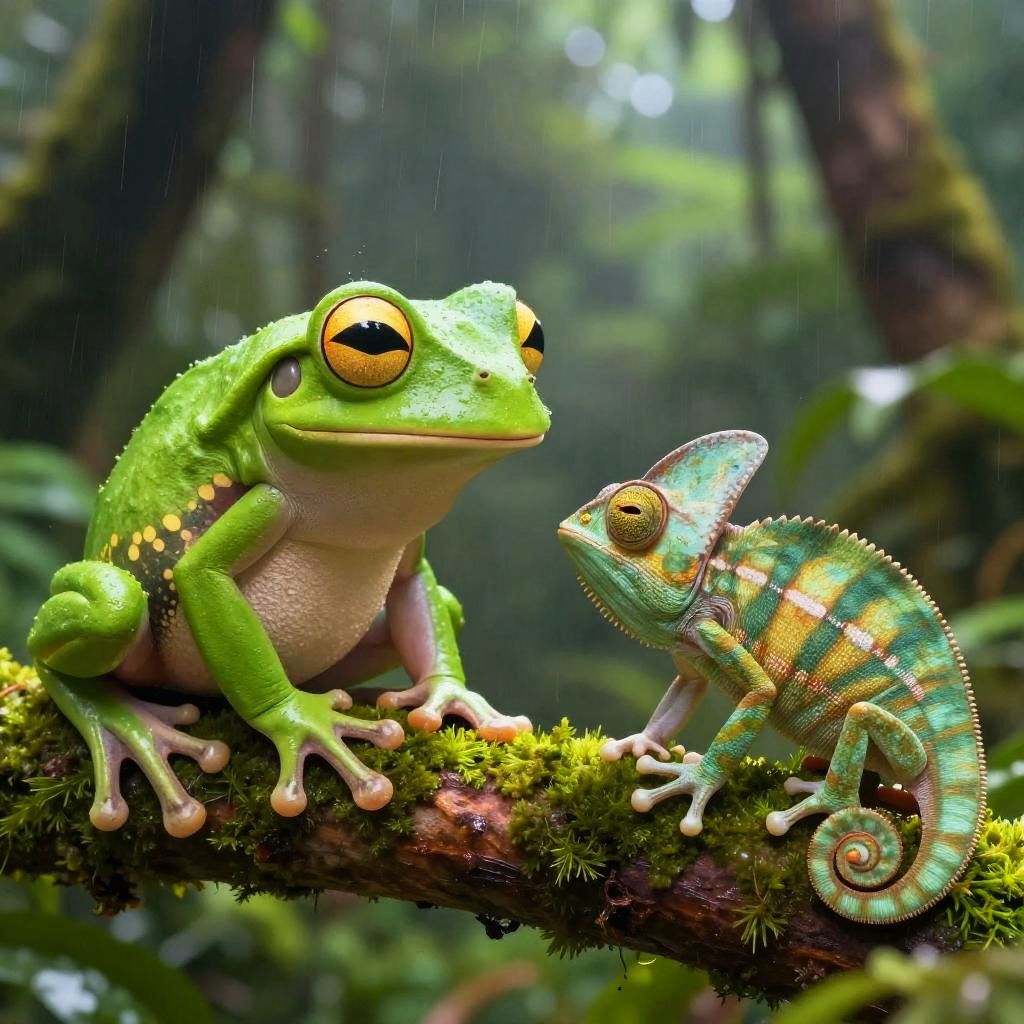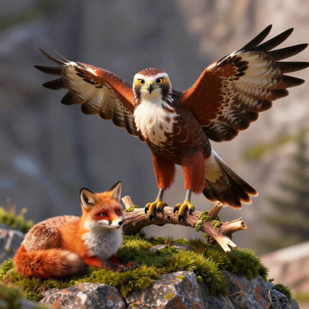 3D Animation of a striped chipmunk perched on a twisted oak branch, peering down at a softly sleeping raccoon reclining on emerald moss, immersed in a dewy misty woodland with soft focus on the striped chipmunk.