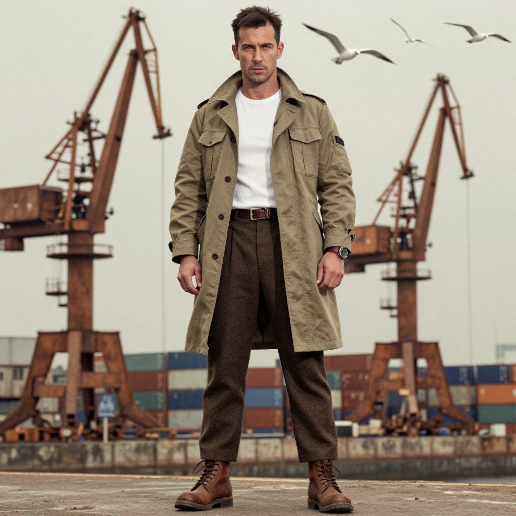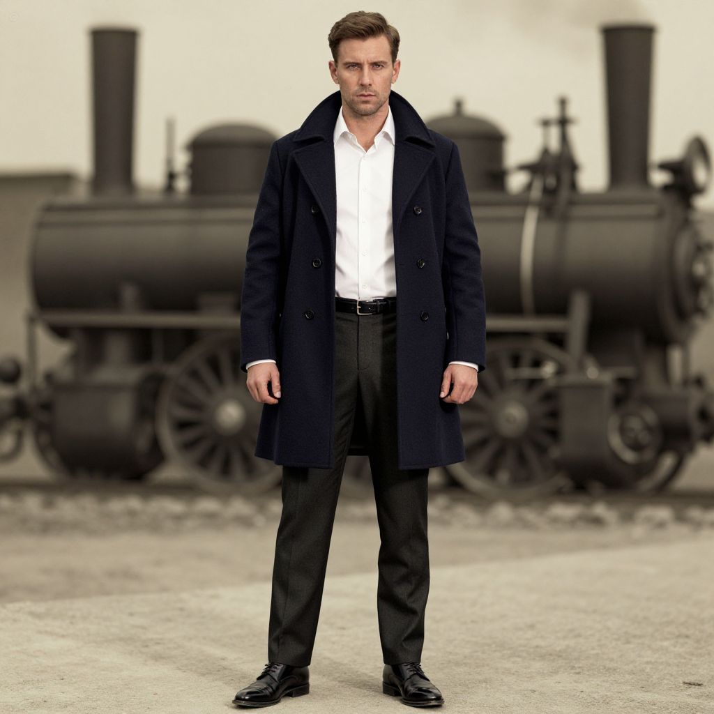 A man, navy wool peacoat, crisp white dress shirt, tailored charcoal trousers, polished black leather shoes, classic leather belt, vintage steam engines, hand-tinted photograph, confident expression Man has masculine face and piercing eyes