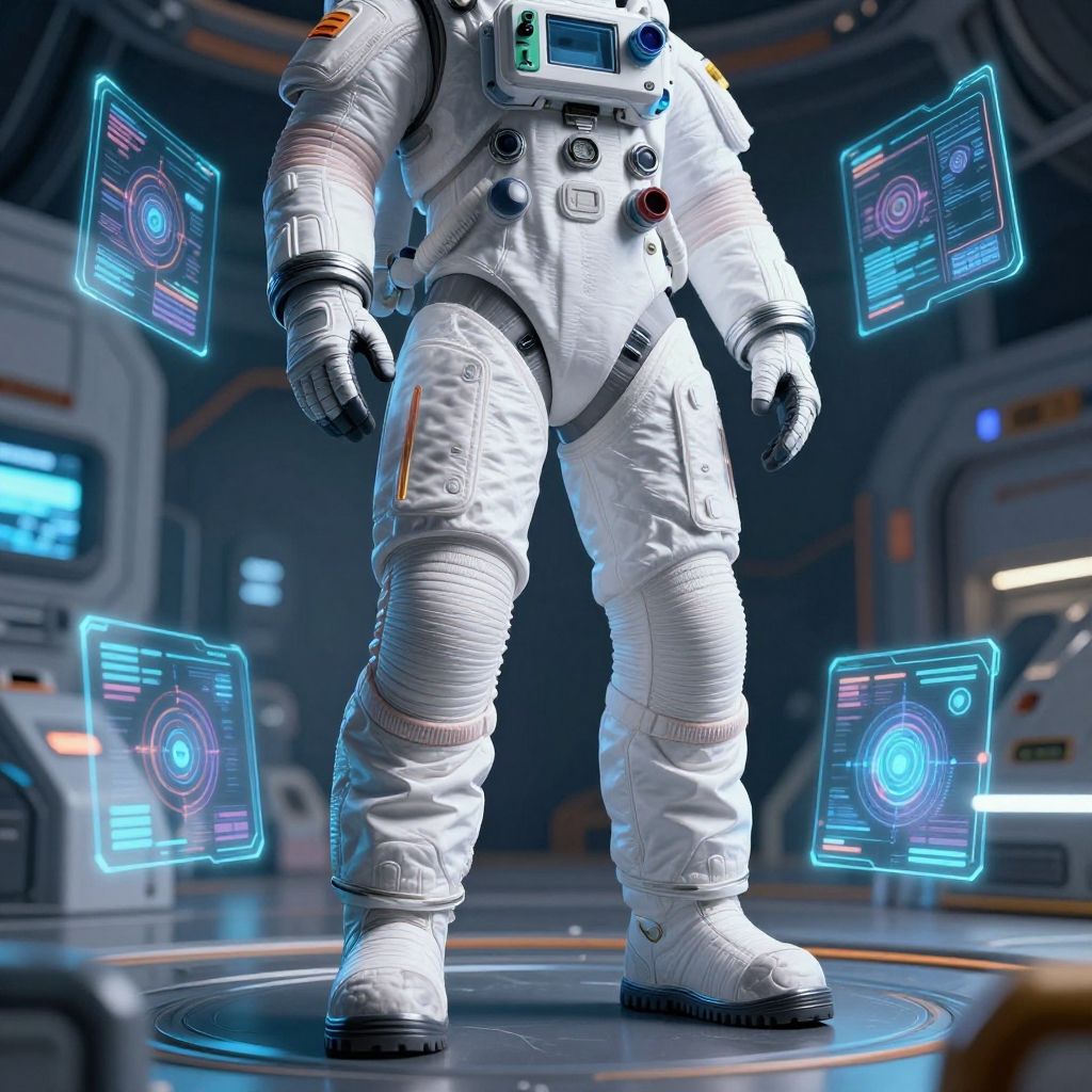 Space suit pants made of advanced nanomaterials, flexible and protective, surrounded by holographic displays, set inside a high-tech space station, vibrant and detailed digital art