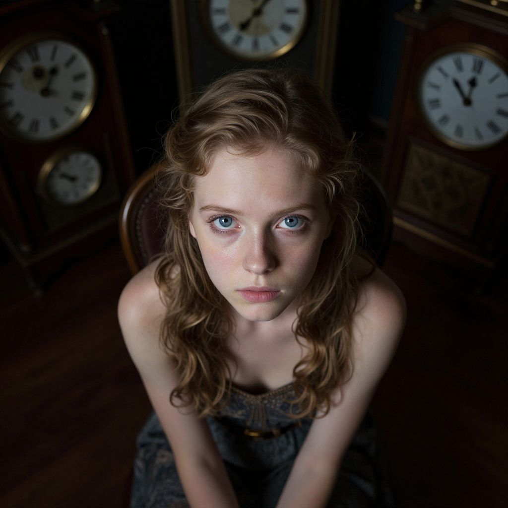 Craft a hyperrealistic portrait focusing on an enigmatic young Nordic woman with striking blue eyes and flawless porcelain skin. Capture her sitting in a dimly lit room amidst antique clocks ticking incessantly. Employ an unusual bird's-eye view to showcase intricate details of her delicate features and the subtle shadows cast by a solitary spotlight illuminating her face from above. This surreal yet photorealistic portrait evokes an emotional spectrum, drawing viewers into her captivating presence and the mysterious ambiance that surrounds her.