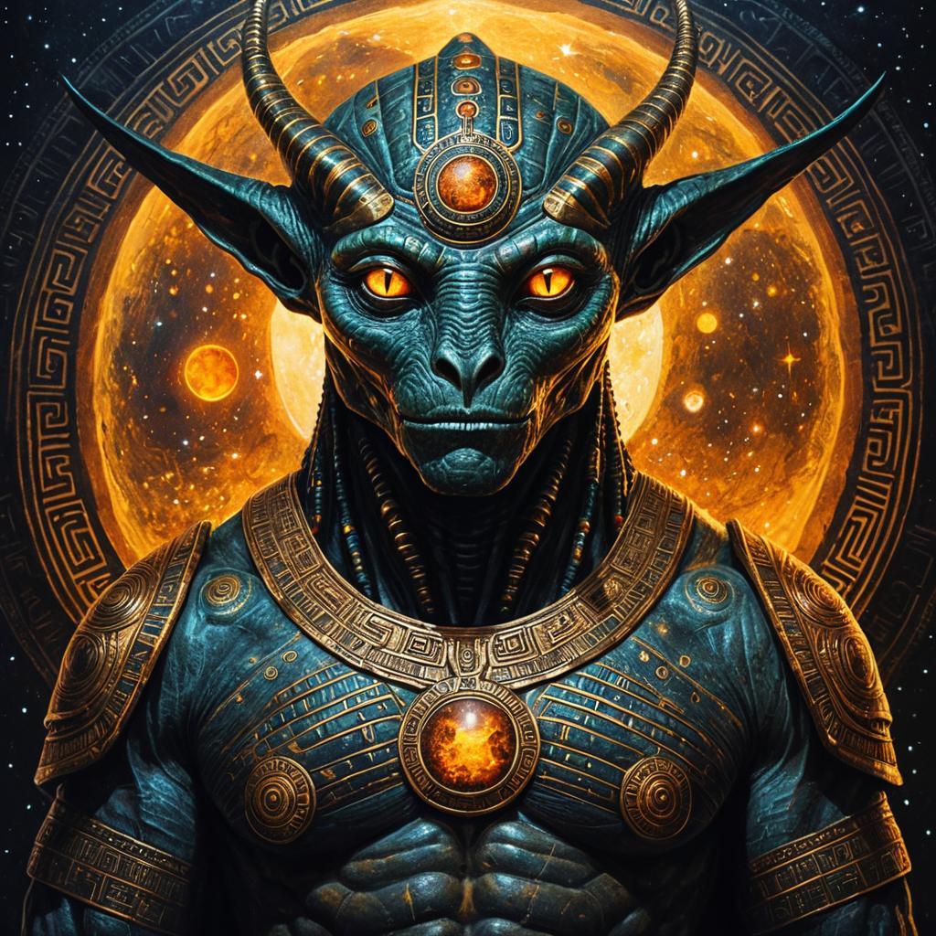 Highly detailed portrait of a male Babylonian-inspired alien creature with bronze skin and glowing amber eyes. The creature features cuneiform tattoos across a muscular chest and is adorned with elaborate golden armor and celestial jewelry. Set against a cosmic background with planets and ancient symbols, the image evokes an ancient cosmic reverence and demigod aura, rendered in an oil painting style.