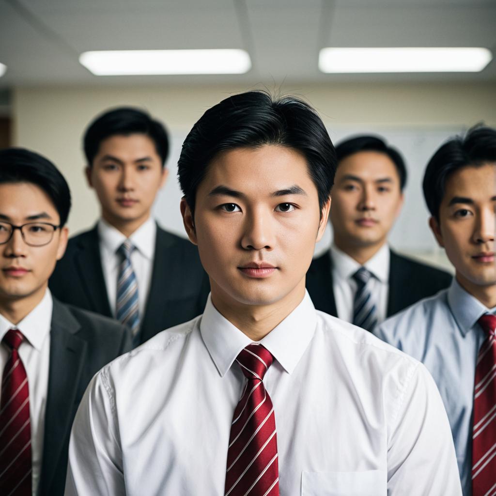 Formal dress male teachers,realistic, necktie, male focus, multiple boys, asian, looking at viewer, red necktie, photorealistic, jacket, white shirt, solo focus, blurry, shirt, formal, suit, indoors, closed mouth, collared shirt, blurry background, standing