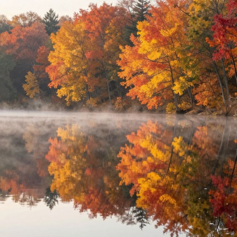 Photograph of a serene autumn lake, reflecting vibrant orange, red, and yellow leaves of surrounding trees. The trees, with varying textures and heights, create a dense forest backdrop. A light mist hovers just above the calm water's surface, adding a dreamy effect. The bright colors of the foliage contrast with the dark, shadowy background of the forest. The image captures the beauty of fall, with the crisp, clear reflection in the still water enhancing the vivid colors of the autumn leaves.
