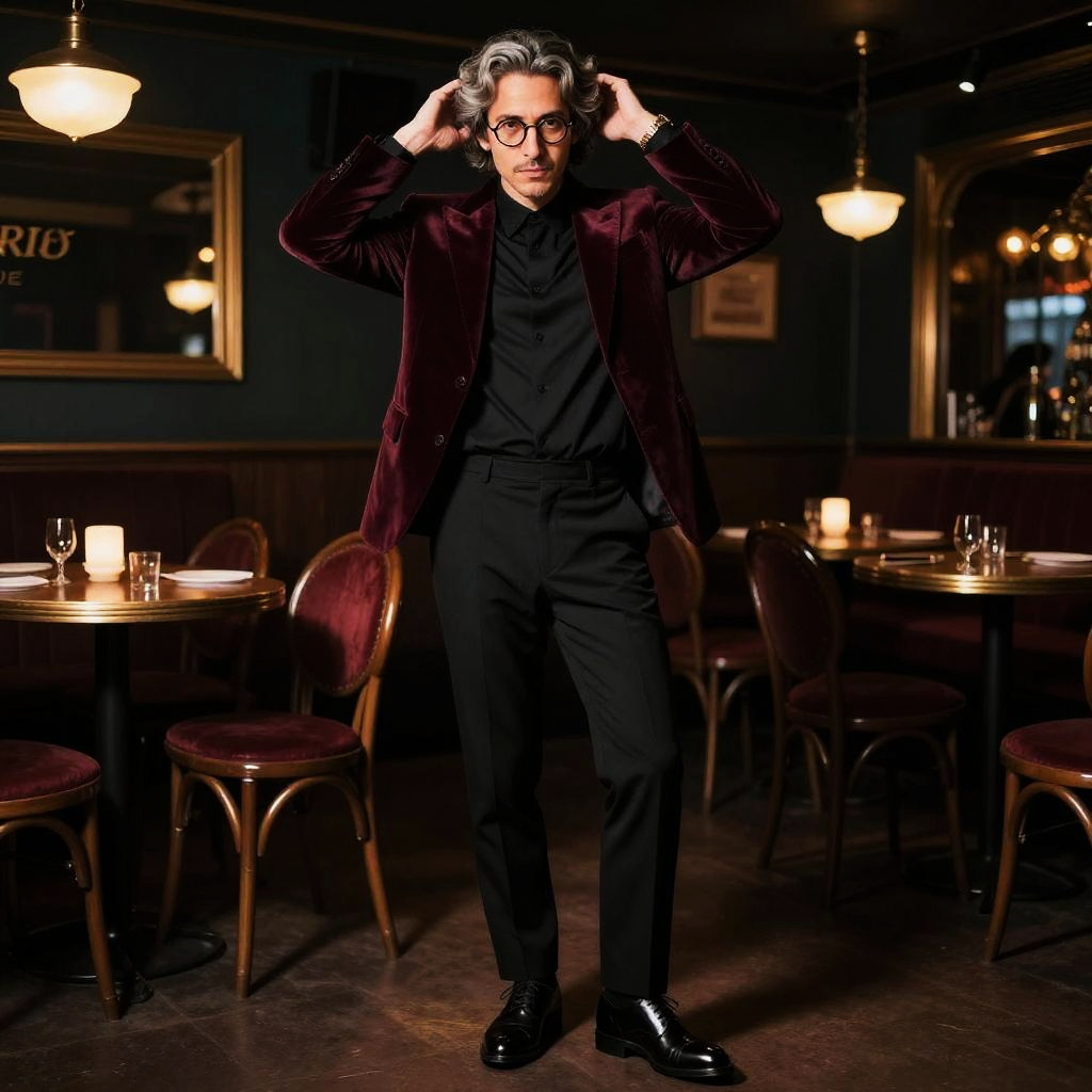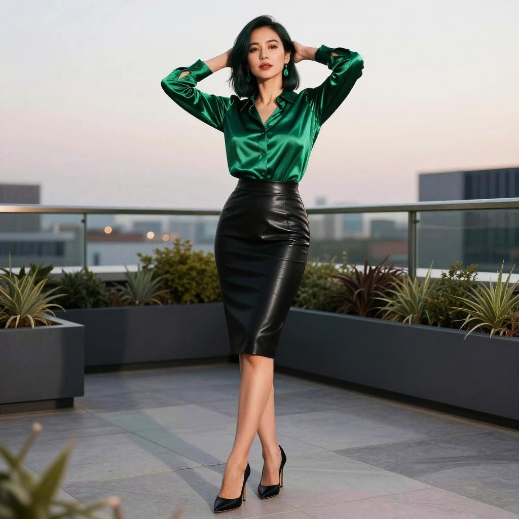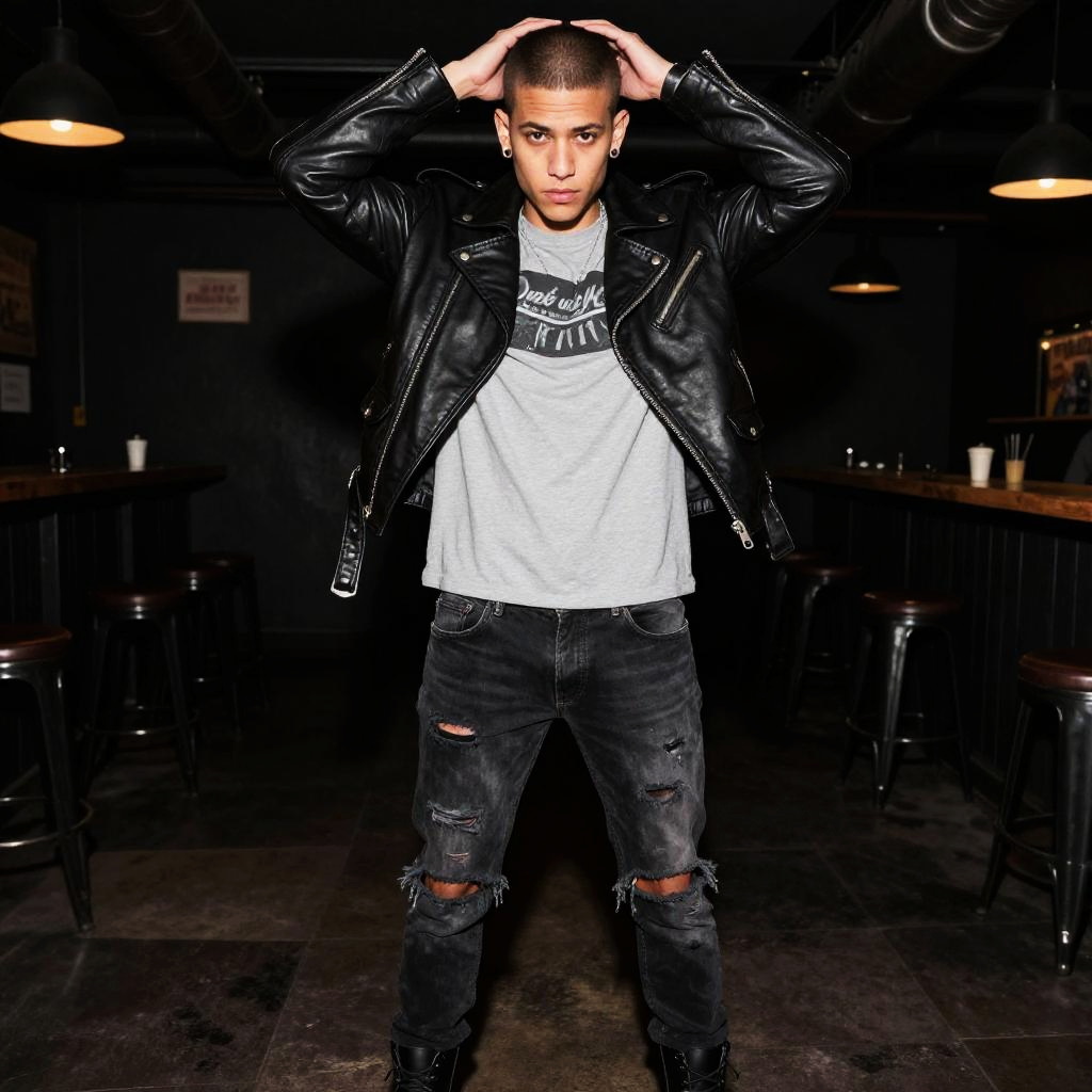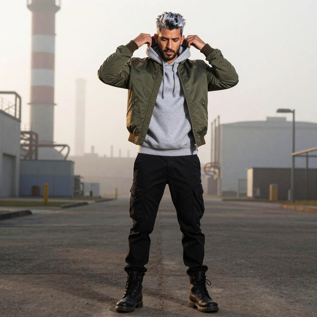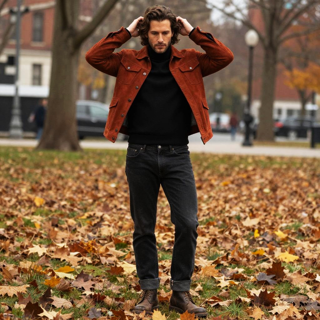 Editorial fashion portrait of man with neat black fades and full beard, wearing black slim-fit turtleneck, dark grey tailored trousers, polished black dress shoes, at minimalist high-rise penthouse with cityscape views, hands loosely crossed in front, half body, clean composition, photorealistic, fine skin texture, high detail, subtle film grain, balanced color grading, rim light and soft haze, crisp edges, shallow depth of field, high resolution, minimal props, modern street style.