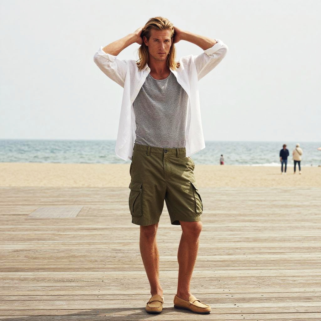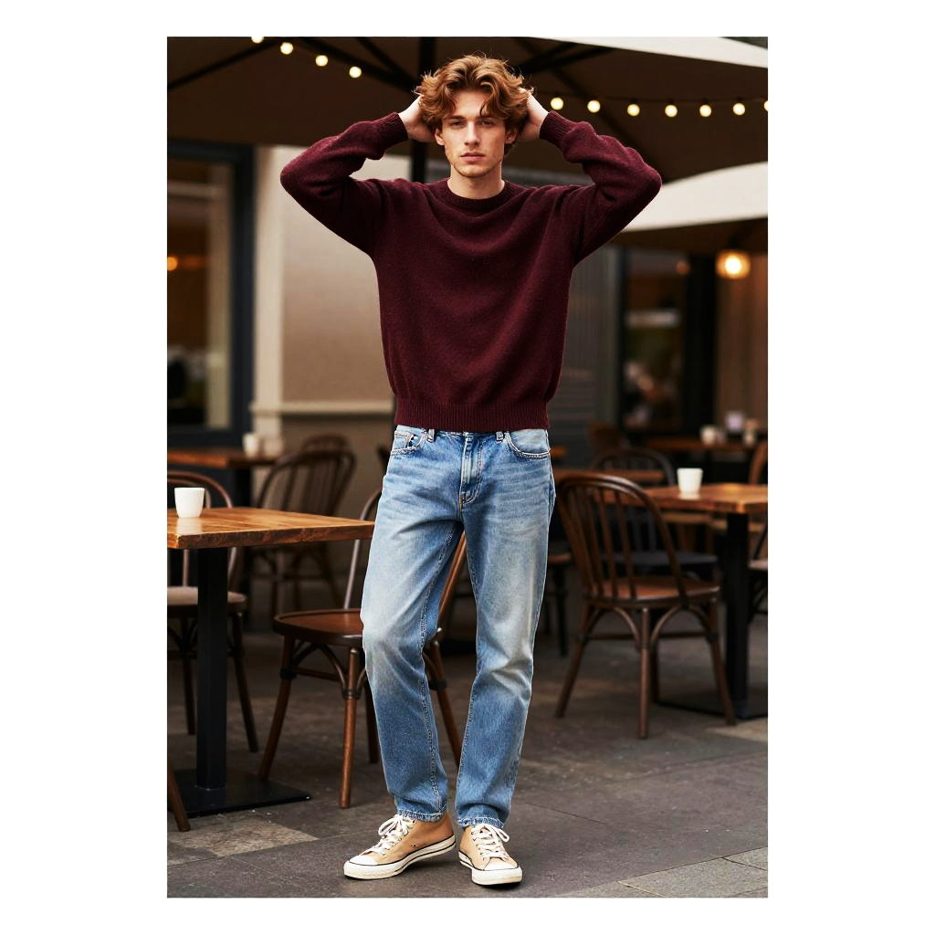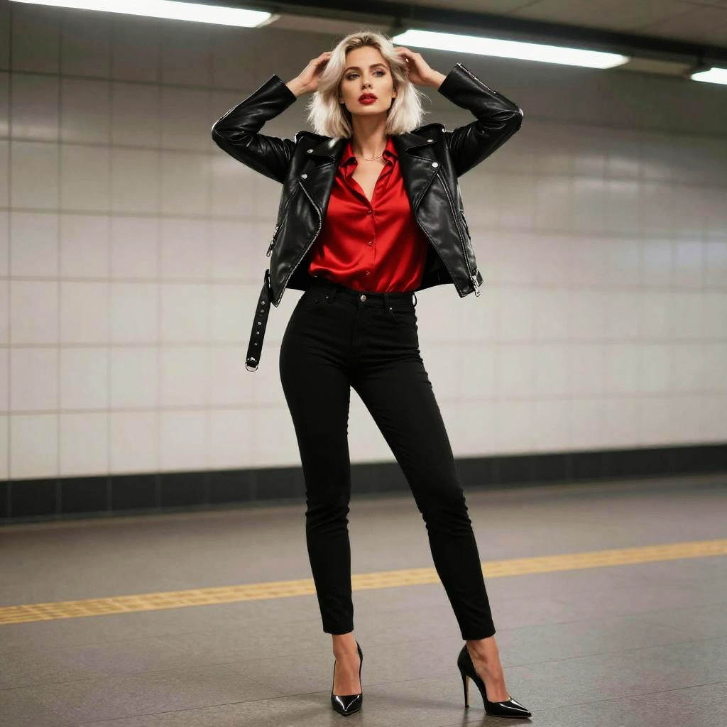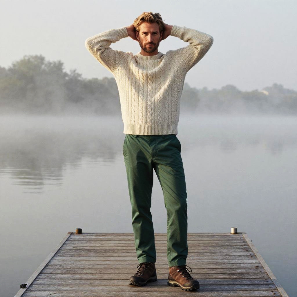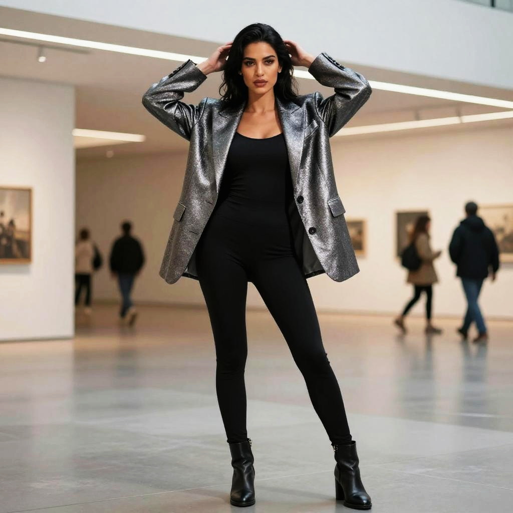 Editorial fashion portrait of man with neat black fades and full beard, wearing black slim-fit turtleneck, dark grey tailored trousers, polished black dress shoes, at minimalist high-rise penthouse with cityscape views, hands loosely crossed in front, half body, clean composition, photorealistic, fine skin texture, high detail, subtle film grain, balanced color grading, rim light and soft haze, crisp edges, shallow depth of field, high resolution, minimal props, modern street style.