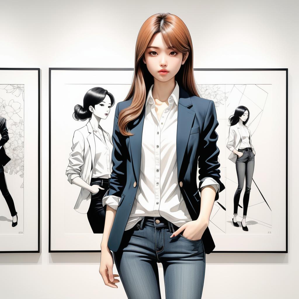 A confident young Asian woman dressed in a modern white blazer, light blue shirt, and dark skinny jeans, standing inside a contemporary art gallery. The background features monochromatic manga-style portraits inspired by classic Toshiko Ueda illustration techniques. The setting has a clean, minimalist aesthetic with light wooden flooring and white walls.