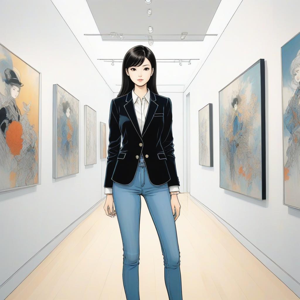 A stylish young woman, wearing a modern blazer and skinny jeans, standing in a contemporary art gallery, expressing confidence, illustrated in the elegant and classic manga style of Toshiko Ueda.
