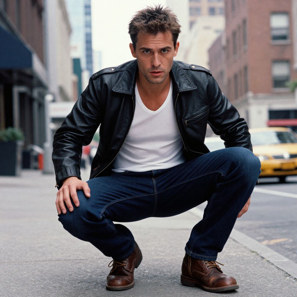 A man, distressed black leather jacket, fitted white t-shirt, dark blue slim-fit jeans, rugged brown leather boots, urban street, kodacolor analog film, confident expression, vibrant city backdrop. Man has masculine face and piercing eyes