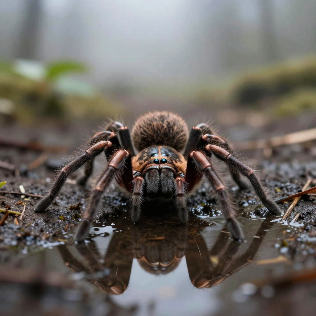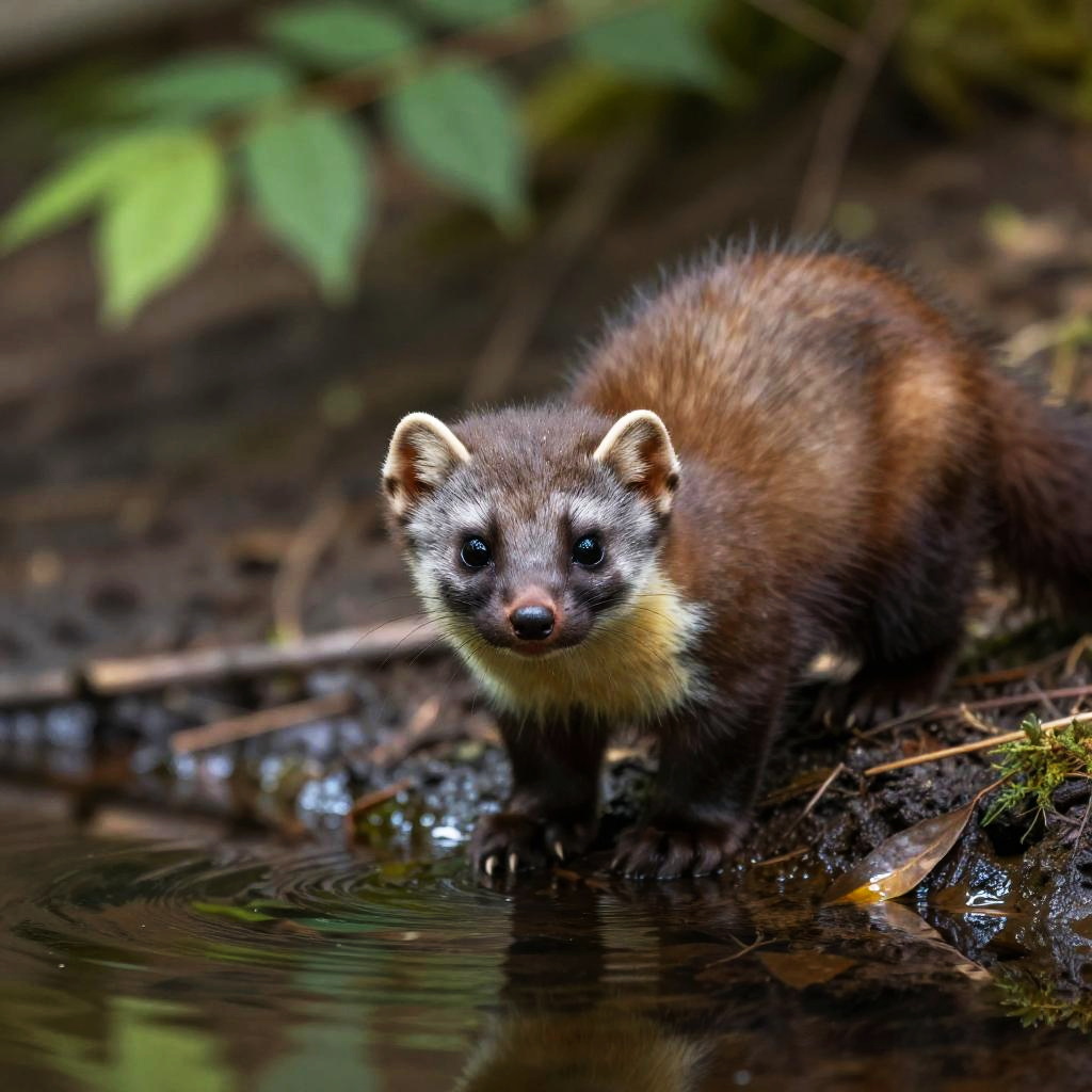 No humans, sunshine, outdoors, nature, pine marten, animal, animal focus, reflection, water, blurry, forest, looking at viewer, tree, plant, leaf, blurry background, whiskers, realistic