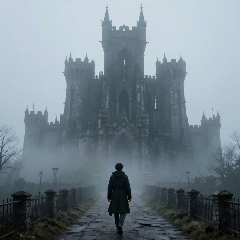A solitary figure walks along a misty, gothic path leading to a towering, ominous castle shrouded in fog.