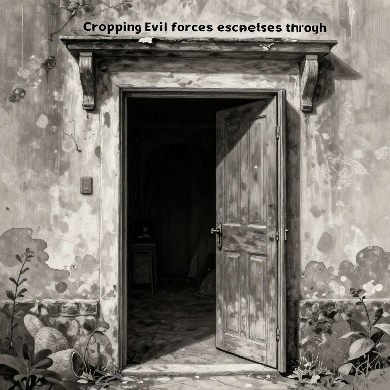 Black-and-white digital drawing of a slightly open wooden door with "Cropping Evil forces escapes through" text above. Dark interior contrasts with light exterior,
