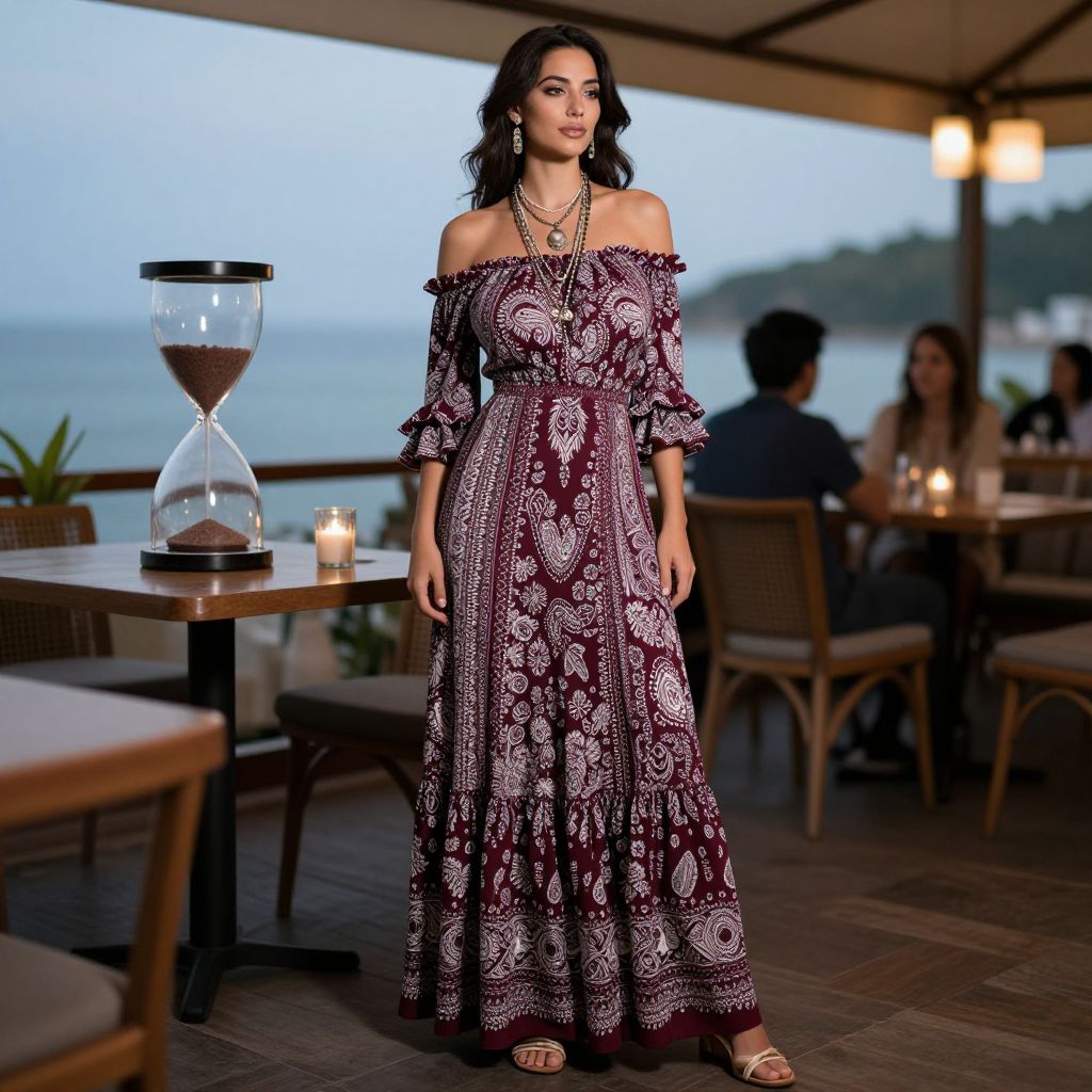 A Hourglass woman, boho-chic, off-the-shoulder maxi dress with a ruffle neckline, burgundy and white paisley and geometric patterns, three-quarter sleeves with ruffle details, fitted bodice, ruffled tiered skirt, floor-length, layered necklaces, one with a pendant, stud earrings, strappy flat sandals, at a Jazz concert in a cozy café. Silky water effect, long exposure, serene landscape Sexy. Pretty face and beаutiful eyes. Big breasts