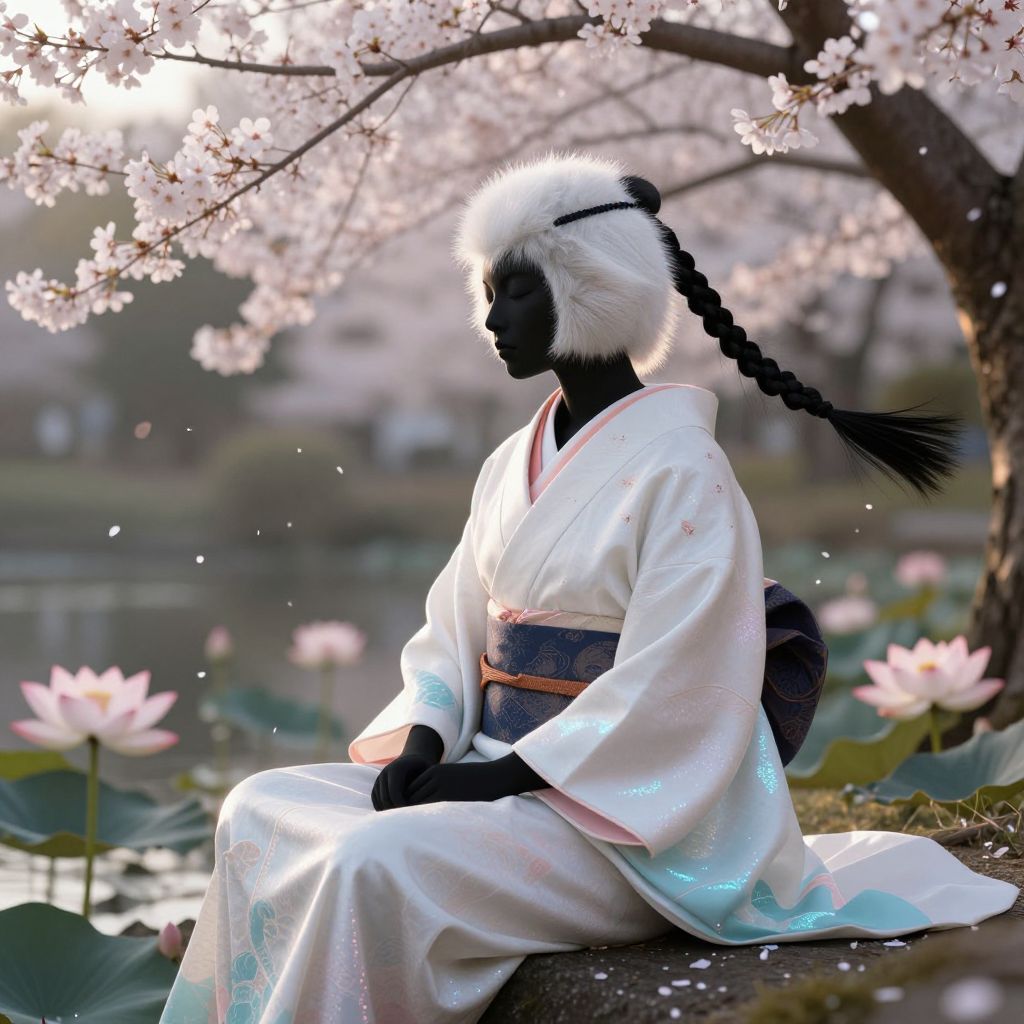 Craft an enigmatic digital artwork depicting a 'bug's-eye view' of a tranquil Japanese garden during the cherry blossom season. In this surreal scene, the blossoms are replaced by radiant neon pink stars that gracefully float across the serene landscape. A lone figure clad in a traditional kimono stands still at the edge of a shimmering koi pond, their face concealed beneath an ornate headdress embellished with more luminous blooms. The soft glow from these celestial blossoms envelops the garden, harmoniously merging the sublime elegance of nature with the captivating allure of cosmic phenomena, instilling a sense of awe and serenity in equal measure.