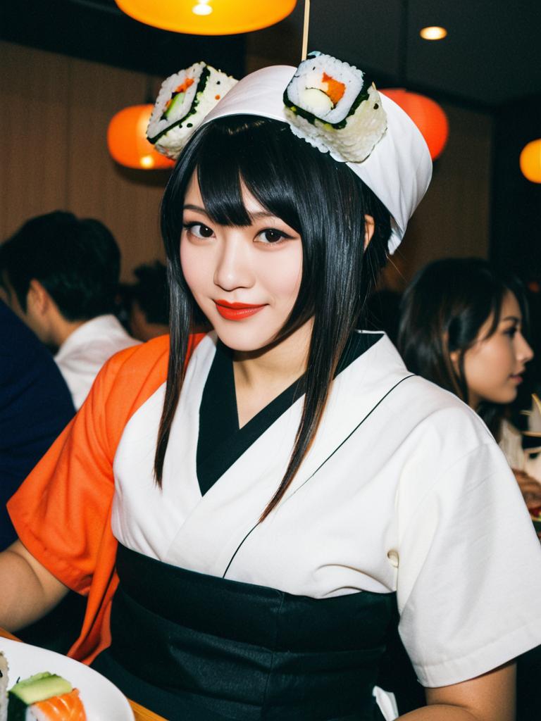 Photograph of an Asian woman with fair skin and black hair, cosplaying as a character from Japanese anime or manga. She wears a vibrant orange and black kimono-style top with a white obi belt, and a white flower crown with an orange and black sushi roll ornament. She has a calm expression and holds a wooden chopstick in her hair. The background shows a dimly lit room with blurred figures of people, some in white shirts, suggesting a social or convention event. The image has a slight digital enhancement effect, making colors pop.
