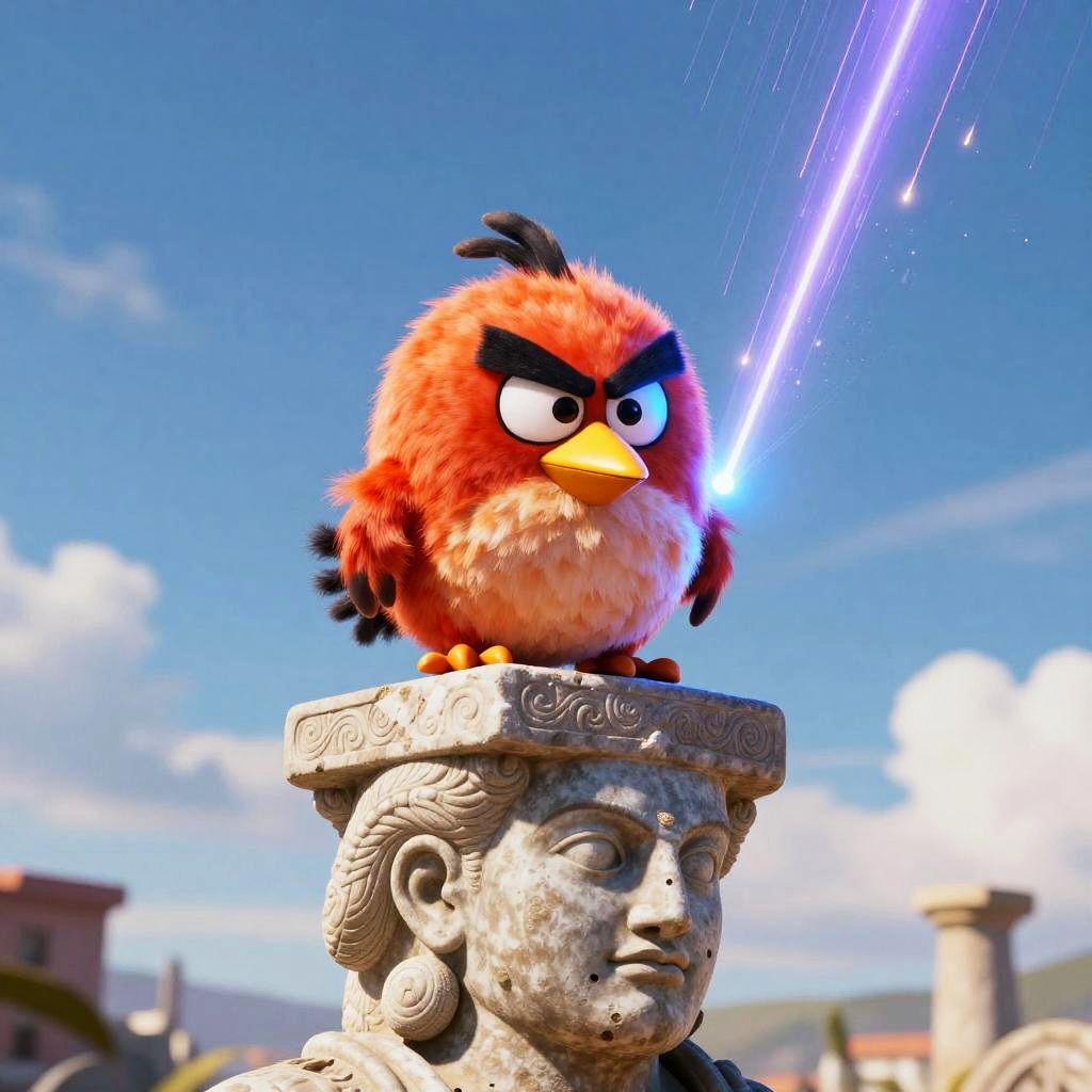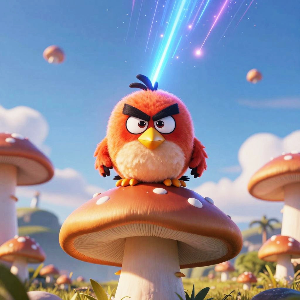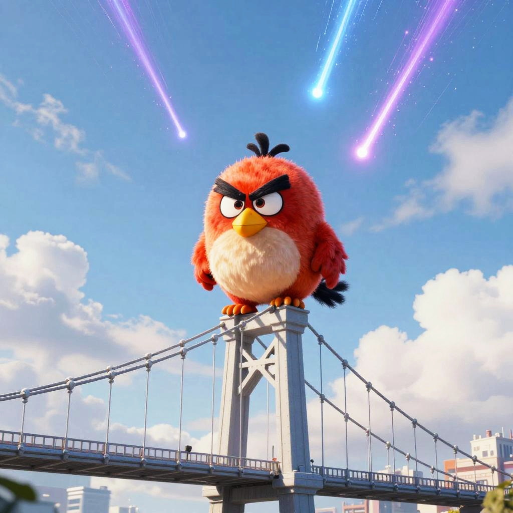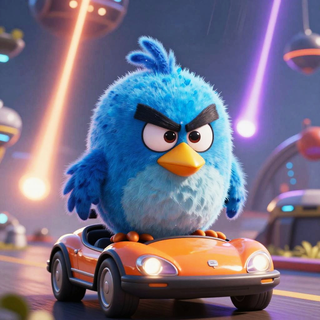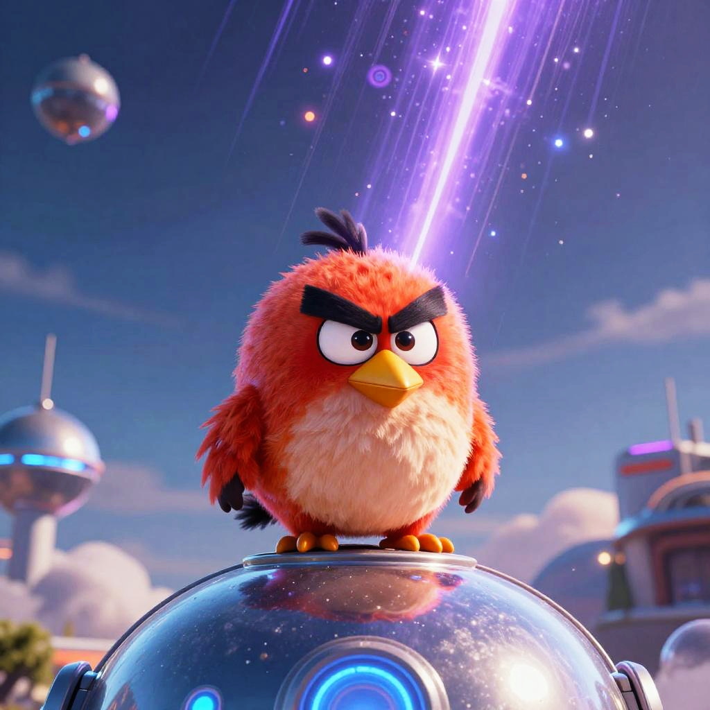 Angry Bird sitting on top of a hot air balloon, bright daylight, funny, Unreal Engine rendering, highly detailed, best quality, high-res, bright colors, glowing blue, orange, and purple, meteor shower in background, surreal, futuristic