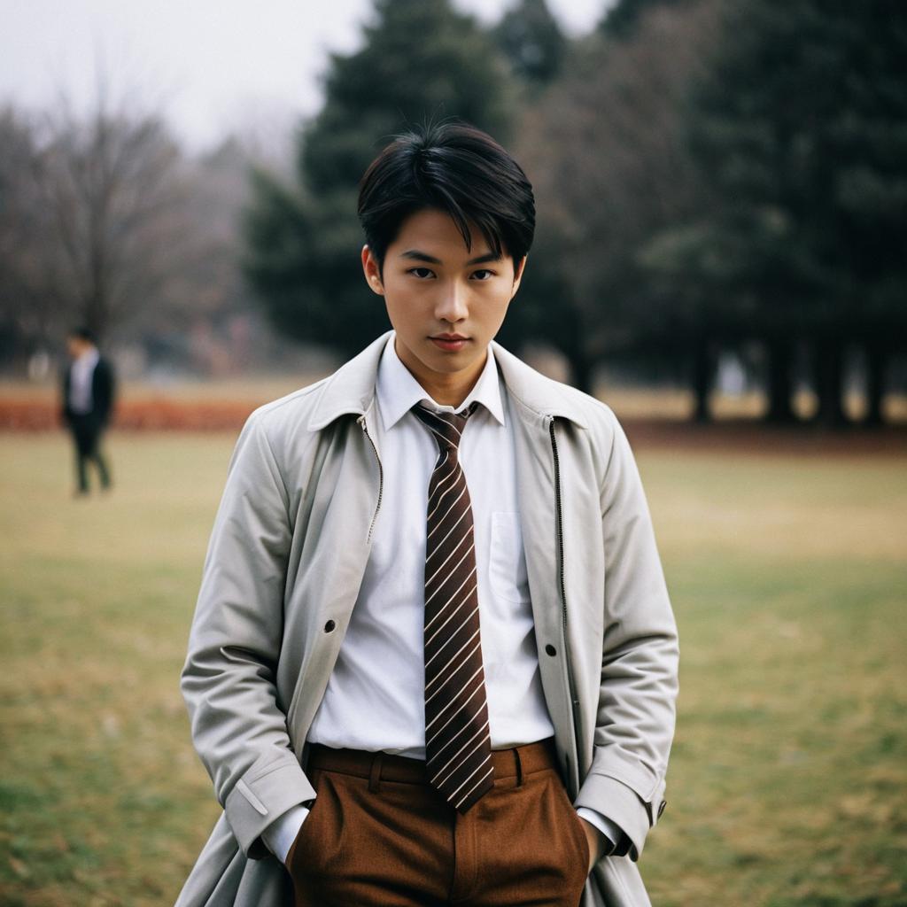Portrait of a young Asian man dressed in a white collared shirt, brown striped necktie, brown pants, and a beige coat. He stands outdoors on a grassy field with blurred trees in the background, hands in pockets, looking directly at the camera with a neutral expression.