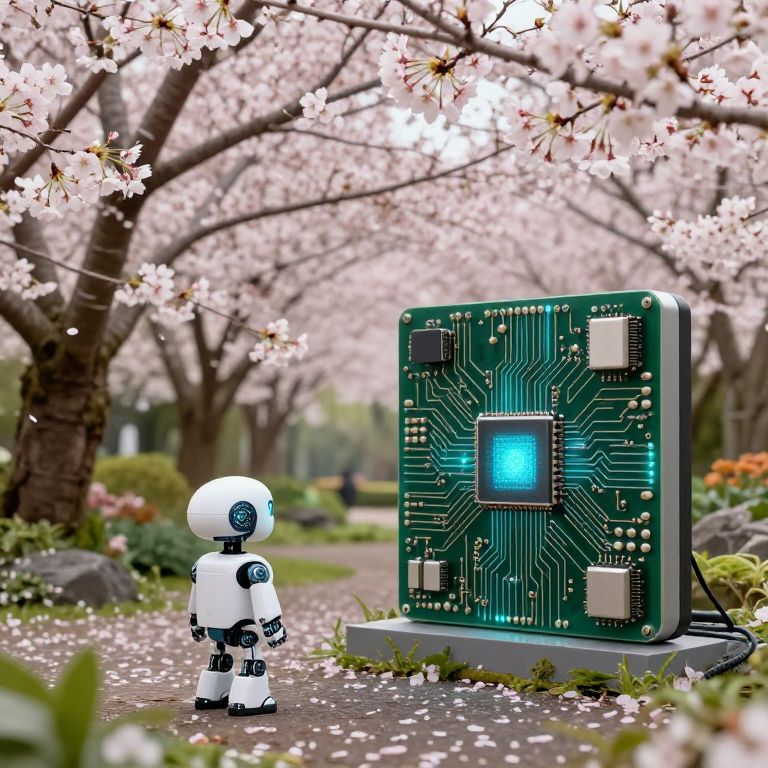 A digitally rendered image features a white, humanoid robot with black accents standing on a paved path amid a cherry blossom tree-lined garden. In the foreground, a green, rectangular circuit board with a glowing blue LED at its center is mounted on a gray pedestal. Cherry blossoms in soft pink fill the background, with petals scattered on the ground. The robot faces the circuit board, creating a juxtaposition between organic and technological elements. The scene is bright with a serene, springtime atmosphere.