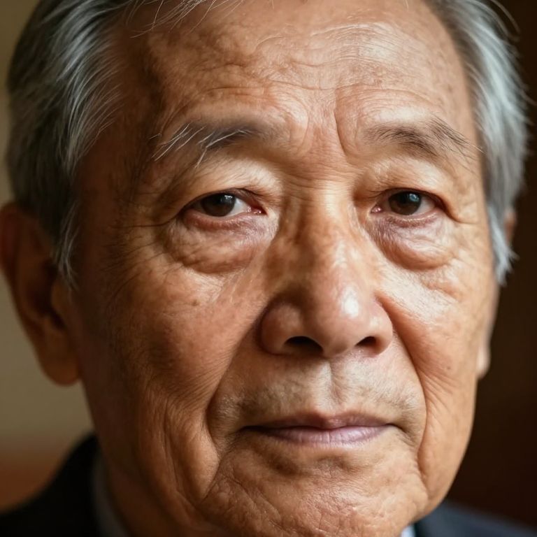 Stable diffusion realistic faces, elderly person's face showing detailed wrinkles and skin imperfections, realistic light reflection, soft but sharp focus on eyes, warm ambient lighting, ultra high resolution, natural skin color variations, textured hair strands