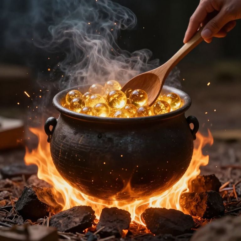 A mystical cauldron brimming with shimmering golden orbs hovers above a fiery pit, illuminated by sparks and smoke, as a wooden spoon stirs the enigmatic contents, defying the boundaries of gravity and reality.