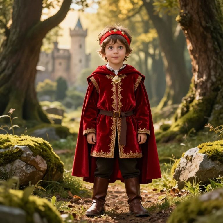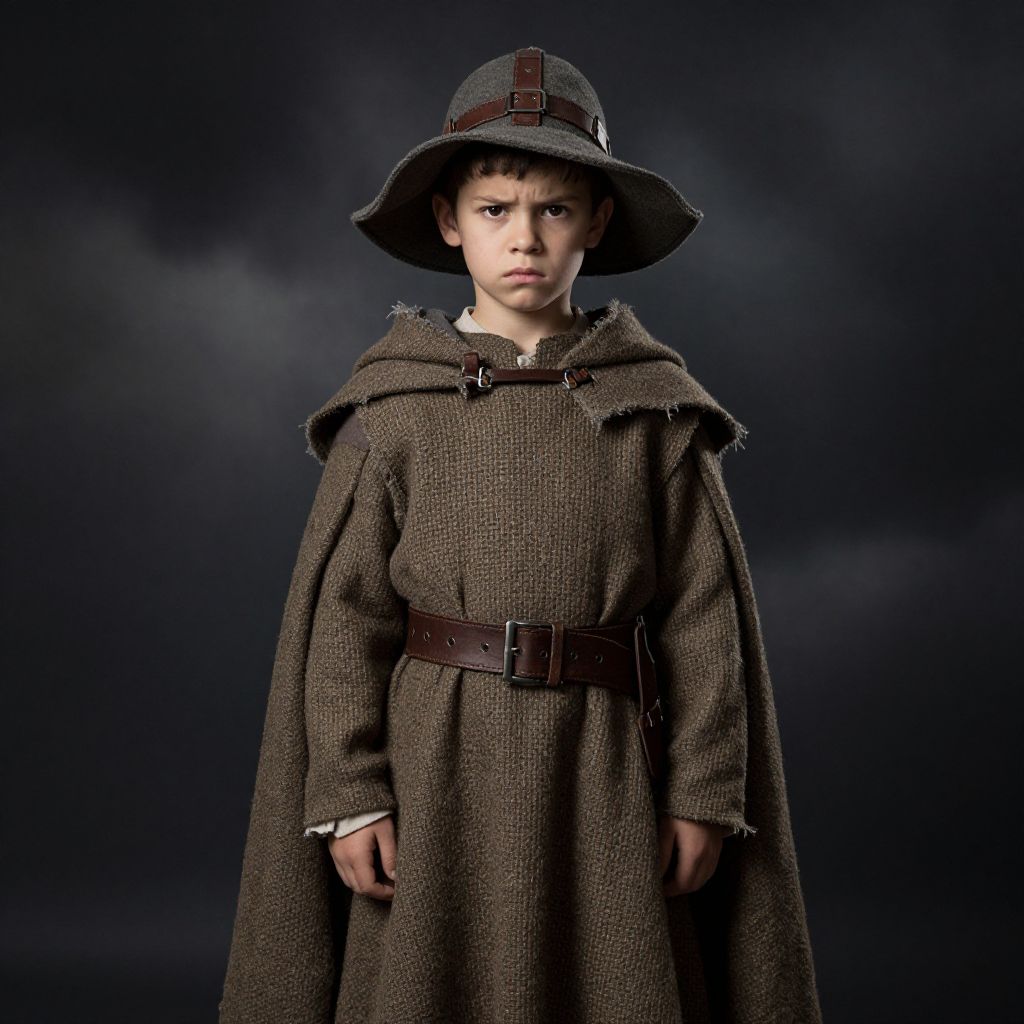 A young child with soft, curly brown hair and bright, curious eyes is wearing a brown robe with a hood that gently falls over their shoulders, fastened with a simple leather buckle. A black belt rests snugly at their waist, adding a sense of quiet dignity. The child stands still, facing forward, in front of a weathered stone wall covered in moss and ancient carvings. The setting is a quiet, timeless countryside, with golden sunlight filtering through the trees in the background, casting long shadows. The atmosphere is peaceful and slightly mystical, evoking a sense of wonder and stillness.