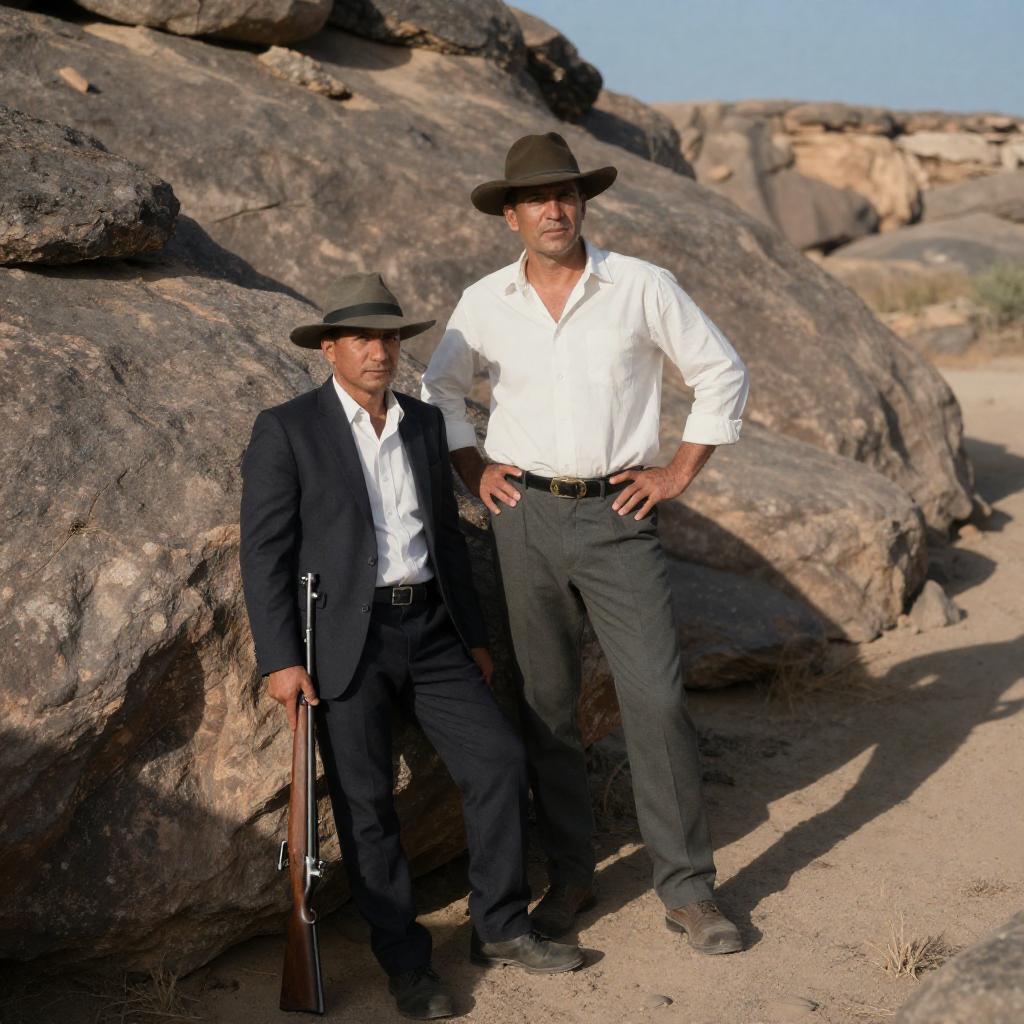 Photograph of two men in a rocky desert landscape. The taller man, wearing a white shirt, gray pants, and a brown hat, stands confidently with one hand on his hip. The shorter man, in a dark suit and hat, leans against a rock, holding a rifle. Sunlight casts shadows on the rocky background.