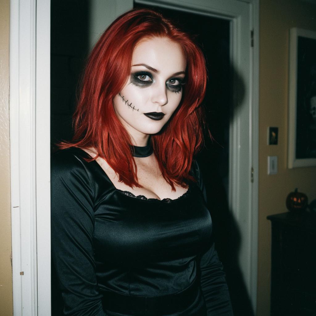 Halloween Costume Woman Make Home, woman with red hair and a black top posing for a picture