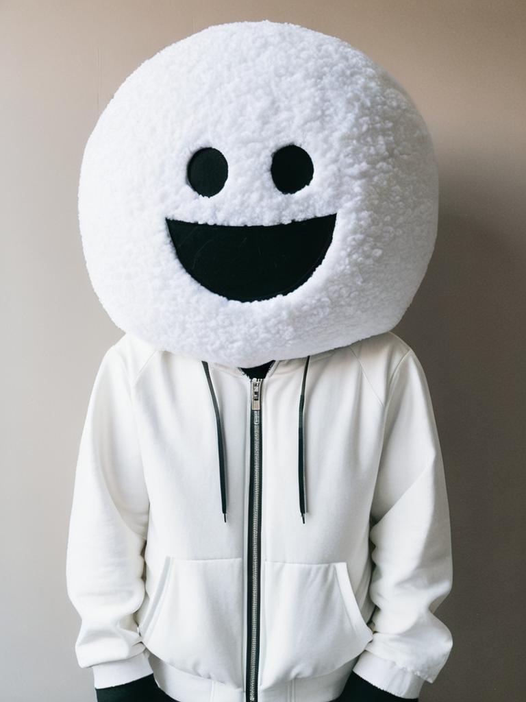 Person dressed in a Snowball (BFDI) cosplay costume with a large, textured white round head featuring black eyes and a wide smiling mouth, wearing a white zip-up hoodie with black drawstrings, photographed against a plain beige background.