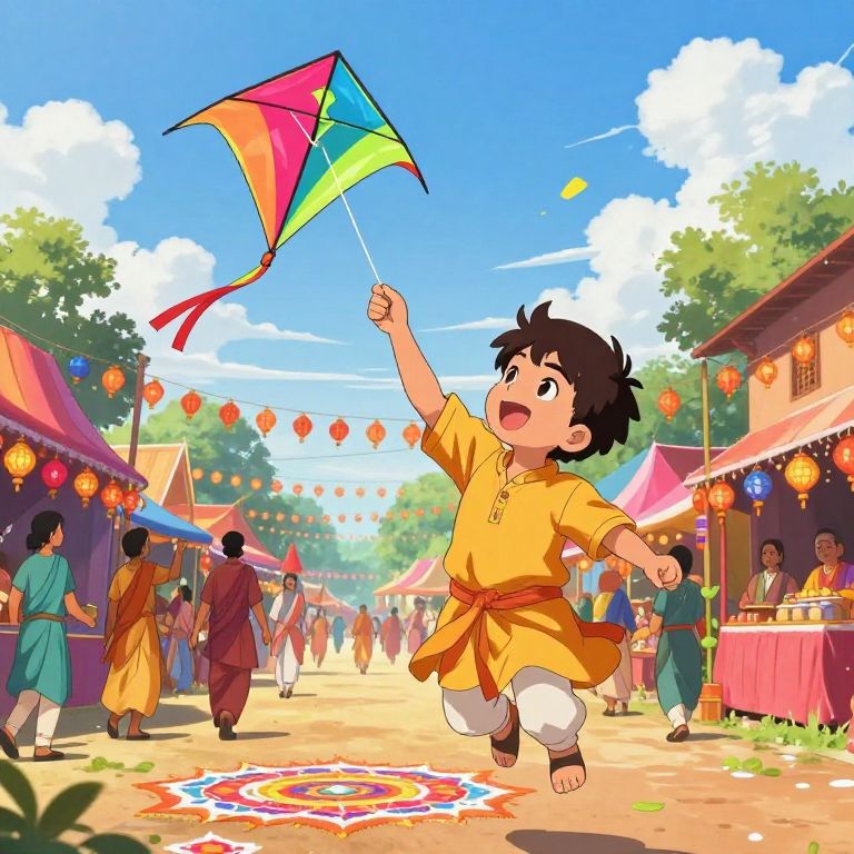 Anime Indian boy flying a colorful kite in a festive atmosphere, bustling village fair with lanterns and rangoli patterns, bright vibrant colors, joyful expression, animated motion lines, cultural elements blending with anime aesthetics, playful and lively scene.