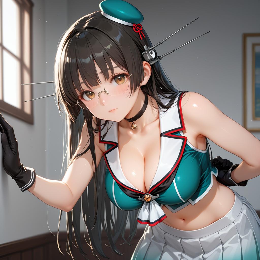 Choukai kai ni (kancolle), kantai collection, 1girl, red eyes, glasses, rimless eyewear, long hair, black hair, hair ornament, large breasts, cleavage, navel, black gloves, pleated skirt, mini hat, beret, headgear, midriff, by artist sayakata katsumi, dark_illustrious