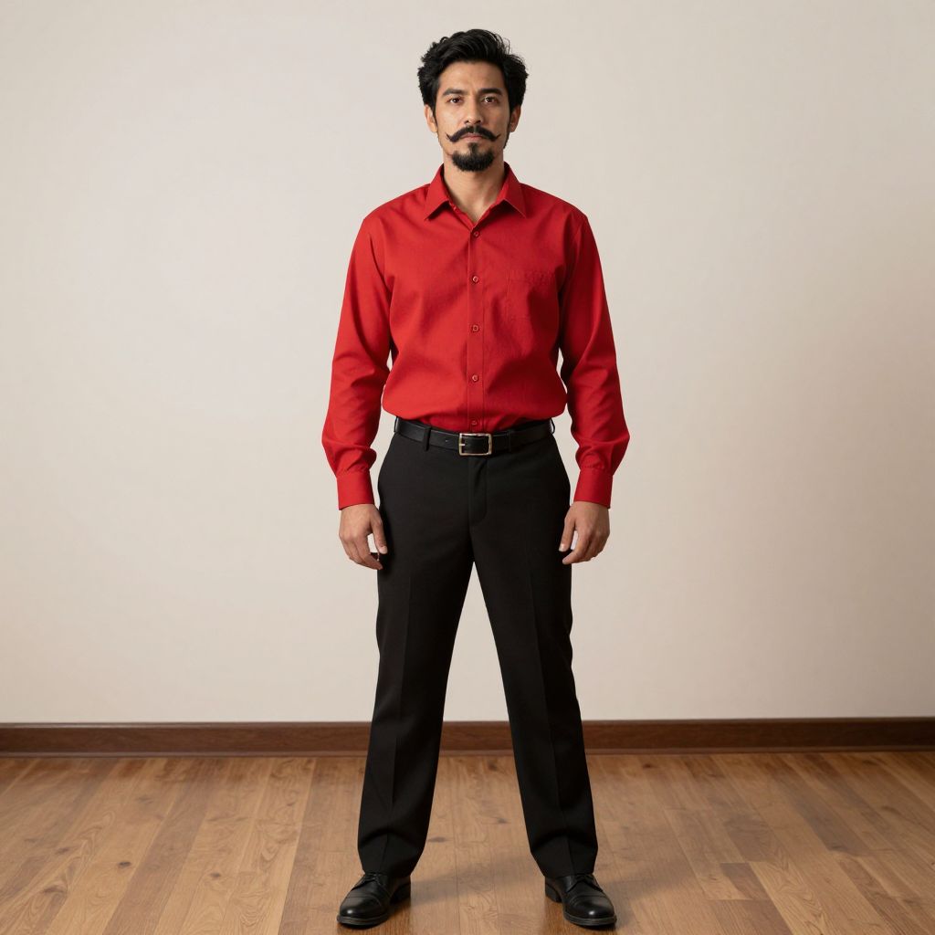 Photograph of a medium-built man with light brown skin and black curly hair, standing against a plain white wall. He has a trimmed black beard and mustache, and is wearing a bright red, long-sleeved dress shirt with the top button undone, black dress pants, and black shoes with a brown leather belt. The wooden floor has a warm, brown hue. The man stands with his arms relaxed by his sides, looking directly at the camera with a neutral expression. The lighting is even, highlighting the contrast between his red shirt and the white background.