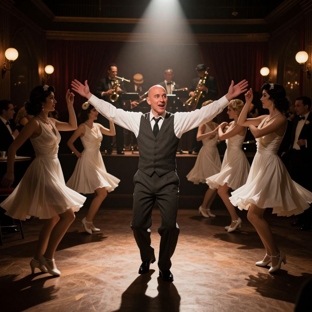 The image depicts a lively scene set in a dimly lit, vintage-style speakeasy, reminiscent of the 1920s. A bald man, dressed in a sharp white shirt, vest, and tie, stands at the center, exuding an aura of confidence and charisma. His arms are outstretched, and his expression is one of joy and excitement, as if he is the star of the show. Surrounding him are several flappers, dressed in white dresses and shoes, energetically dancing in a synchronized manner. The lighting is dramatic, with a single spotlight illuminating the man and the dancers, casting deep shadows and creating a sense of depth and movement. In the background, a band is playing, their instruments barely visible but their presence felt through the rhythmic energy of the dancers. The overall composition is dynamic, with the man and dancers positioned in the foreground, drawing the viewer's attention, while the band and other patrons form a blurred backdrop, adding to the atmosphere of a bustling, lively night out.