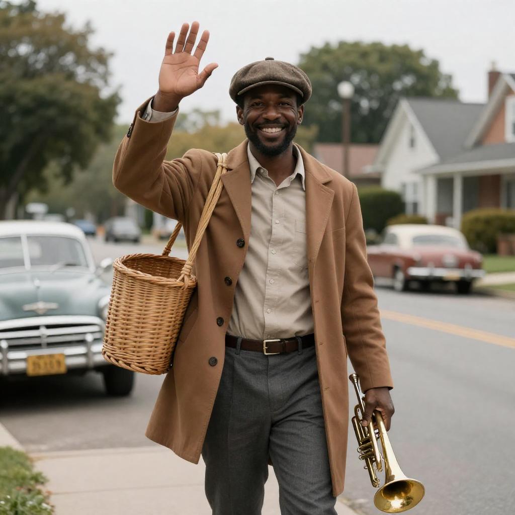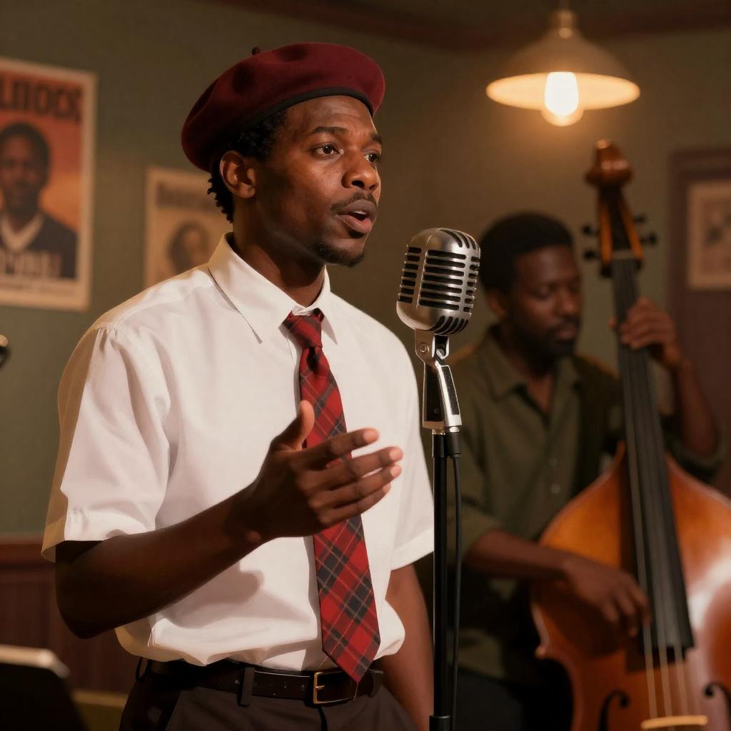 A digital illustration of a Black male jazz singer with dark skin, wearing a white shirt, red plaid tie, and matching beret, standing at a vintage microphone. He gestures with his right hand while a bass player with dark skin, wearing a green shirt, plays in the background. The dimly lit room features warm, yellow-orange lighting, vintage posters, and a hanging lamp.