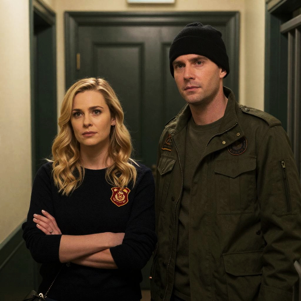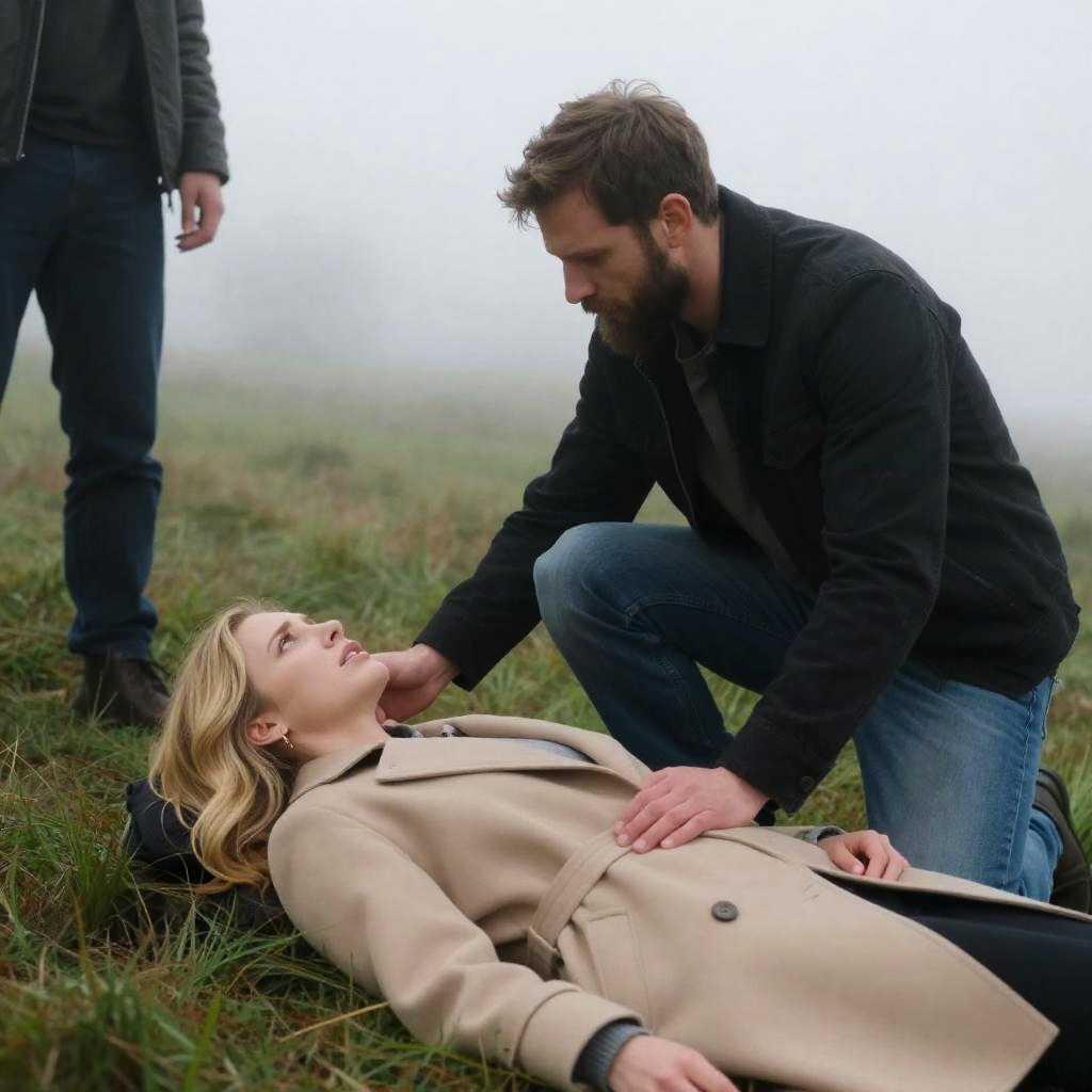A woman with blonde hair, wearing a gray sweater, kneels over a bound man in a black jacket on the floor. Two men in the background. Industrial room with metal shelves, chair, and dim lighting. Woman's expression is concerned. Man on floor is unconscious. One standing man looks towards them.