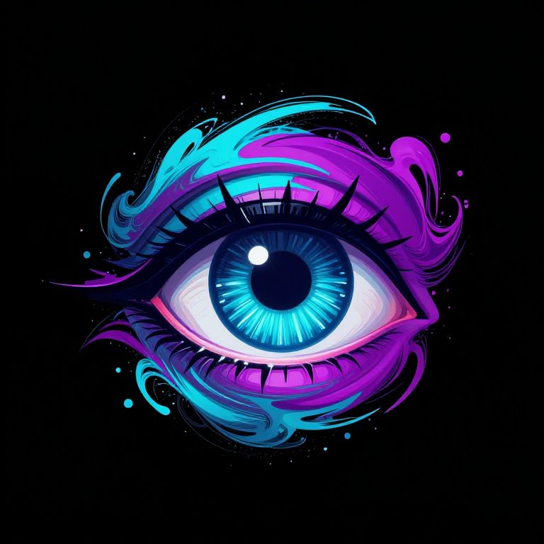 A vibrant digital illustration of a glowing blue eye with intricate, swirling neon purple and cyan highlights. The eye is centrally placed on a black background, with long, exaggerated eyelashes and a bright white pupil. Surrounding the eye are dynamic, abstract, wispy patterns in pink, purple, and blue, adding a sense of movement and energy. The image uses bold, neon colors and a futuristic, cyber-style aesthetic, creating a striking, otherworldly visual effect.