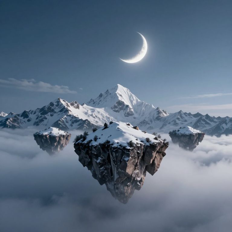 Snow-capped peaks pierce the heavens, suspended above a sea of clouds, as a luminous crescent moon watches over this ethereal realm where mountains float like celestial islands.