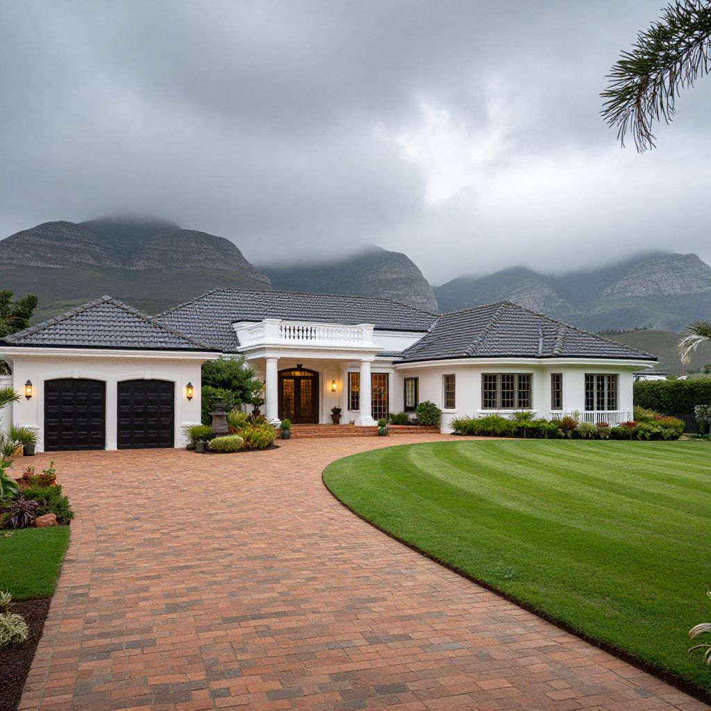 Elegant mansion nestled in the wealthiest suburbs of South Africa, featuring a sprawling brick driveway, lush green lawn, and panoramic views of misty mountains under a dramatic sky.