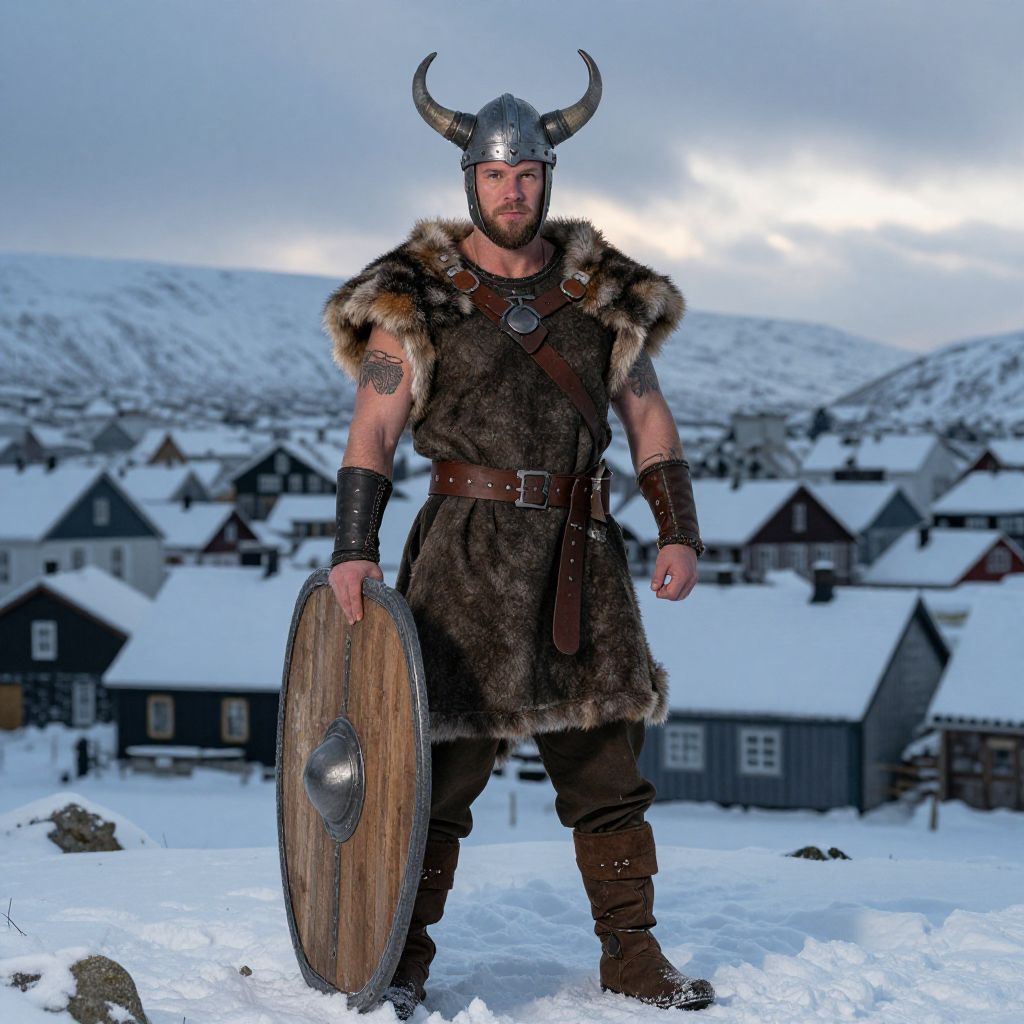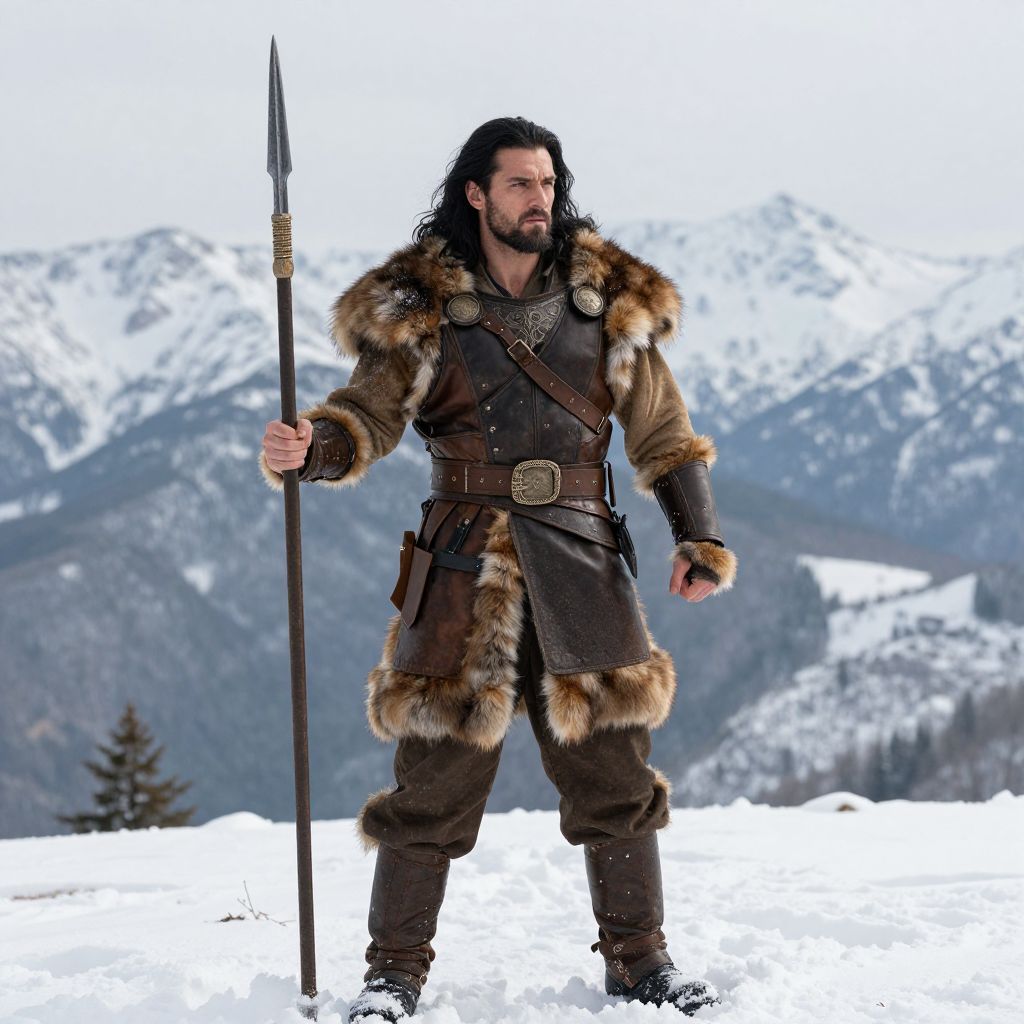 Muscular Viking Warrior in Snowy Mountains