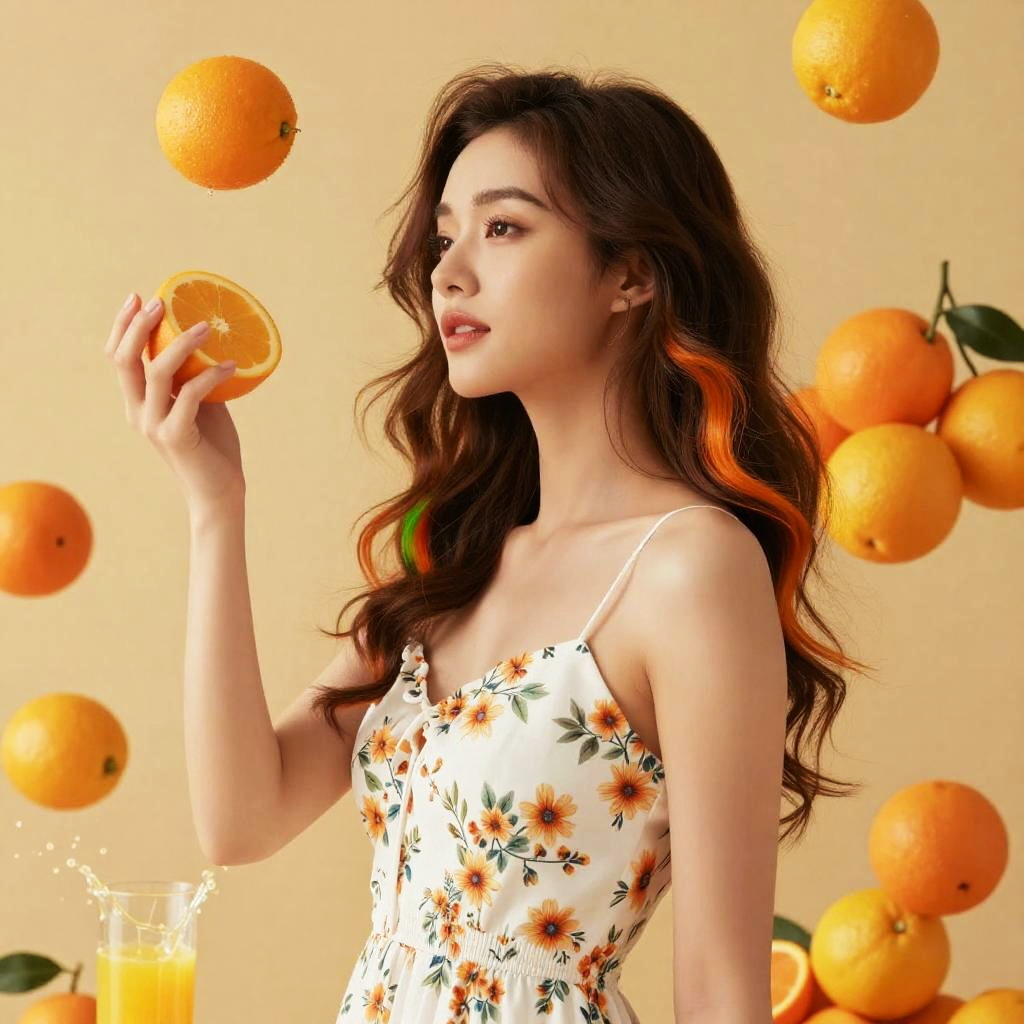 Beautiful Asian woman wearing a floral white dress, citrus fruits flying around, rainbow orange highlights, background of assorted citrus fruits, splashes of orange juice, sideview, textured, photo realistic