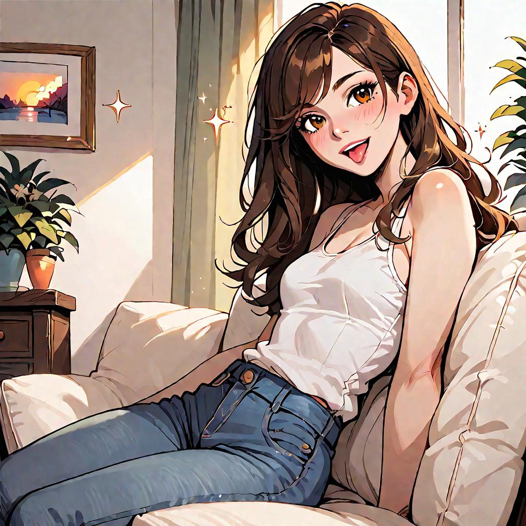 Score_9, score_8_up, score_7_up, score_6_up, score_5_up, score_4_up, source_anime, inside, living room, couch, window, curtain, sunset, sunbeam, side view, sparkles, brown eyes, open mouth, smile, tongue, teeth, looking at viewer, excited, solo, female, long hair, swept bangs, brown hair, small breasts, white tank top, denim pants, reclining