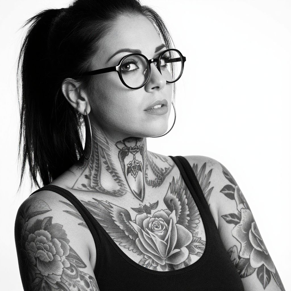 Black and white photograph of a heavily tattooed woman with dark hair in a ponytail, wearing large round glasses and hoop earrings. She has intricate tattoos on her neck, chest, and arms, including a prominent bird and rose design on her chest. Her expression is serious, and she's slightly turned to the side. The background is white, making her tattoos and features stand out sharply.